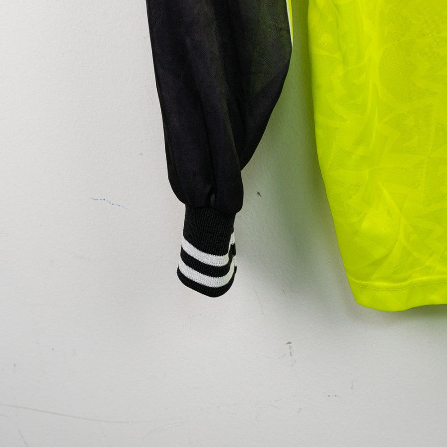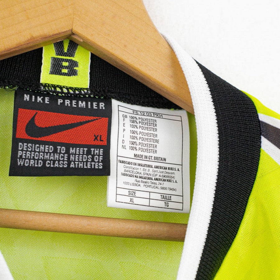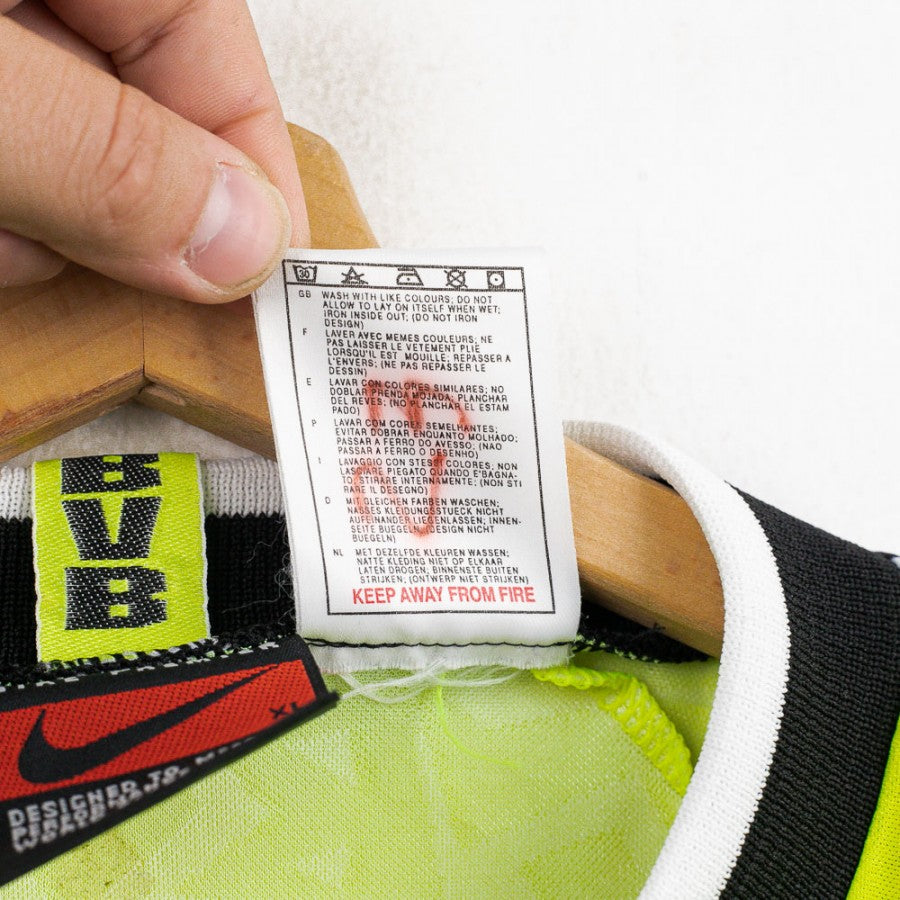Borussia Dortmund Nike Ml 14 1995/1996 Home Shirt. Borussia Dortmund long-sleeved home shirt from the 1995/1996 season, made by Nike. The shirt was exchanged at the end of the match by a former Juventus player at the end of the match Juventus 1-3 Borussia Dortmund. 1995-1996. (The name will be on the COA) The design is unmistakable: bright fluorescent yellow with black sleeves, collar and cuffs finished in black and white. The BVB 09 club crest and the Nike logo are featured on the chest, while the historic commercial sponsor Die Continentale stands out in the centre. The official UEFA Champions League patch is featured on the right sleeve. Size XL.