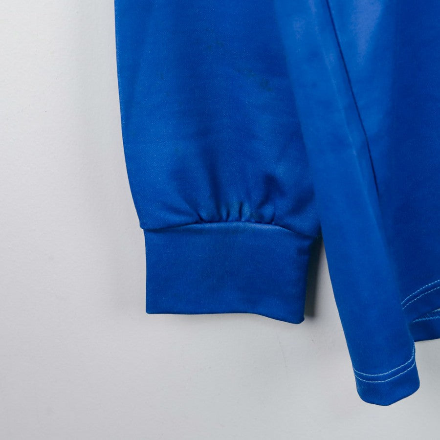 The official Brescia Calcio Home jersey for the 1991/1992 season, produced by technical sponsor Uhlsport, is a true classic of '90s football. Made in a stylish blue color, it features a distinctive design with a large white gradient "V" on the chest that frames the "CAB" commercial sponsor logo. The Brescia Calcio crest, with the lion rampant, is applied on the left chest, while the back displays the number 4 in simple white font. This long-sleeved jersey is in size XL, making it perfect for collectors and fans of the Rondinelle.