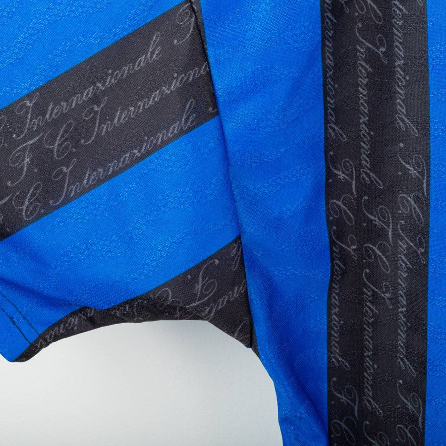 Inter Milan home shirt from the 1997/1998 season by Umbro, one of the club’s most iconic kits, worn during the UEFA Cup-winning season with Ronaldo. Classic black and blue stripes featuring the “F.C. Internazionale” script within the black bands. Black polo collar with blue and white trim. Embroidered Umbro logo and Inter crest on the chest, printed white Pirelli sponsor at the center. “Vapa Tech Performance” label stitched on the back collar. Size XL.
