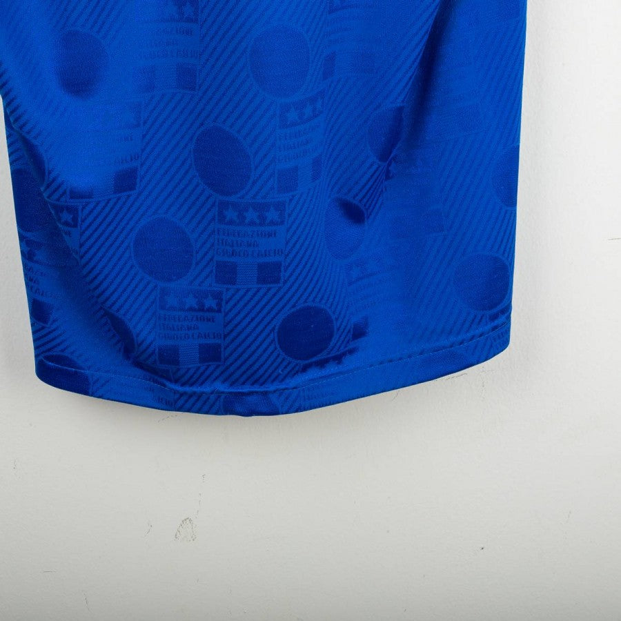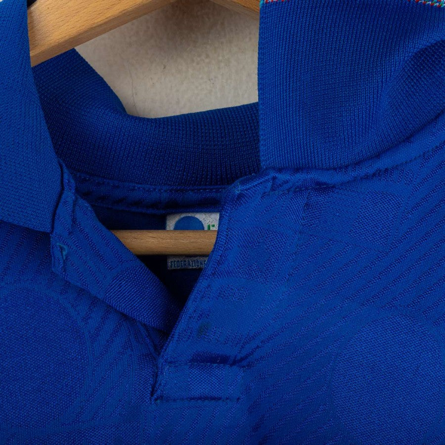 Italy home jersey made by Diadora for the 1994 USA World Cup, customized with Roberto Baggio’s name and number 10. Classic azzurri design with jacquard FIGC pattern and tricolor details on collar and sleeve edges. Embroidered FIGC crest with three stars on the left chest and Diadora tag inside the collar. On the back, “R. BAGGIO” name set and number 10 in white with silver outline. Regular fit. Size L.