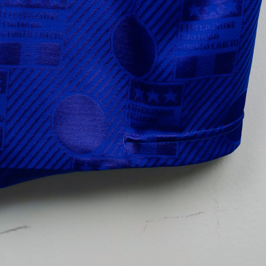 Home shirt worn by Italy during the USA 1994 World Cup, made by Diadora and featuring Roberto Baggio with number 10. The Diadora branding appears on the inside tag, with the classic World Cup FIGC crest on the chest. The iconic blue shirt features an all-over geometric pattern and tricolor accents on the collar and sleeve edges. Size M as shown on the internal label.