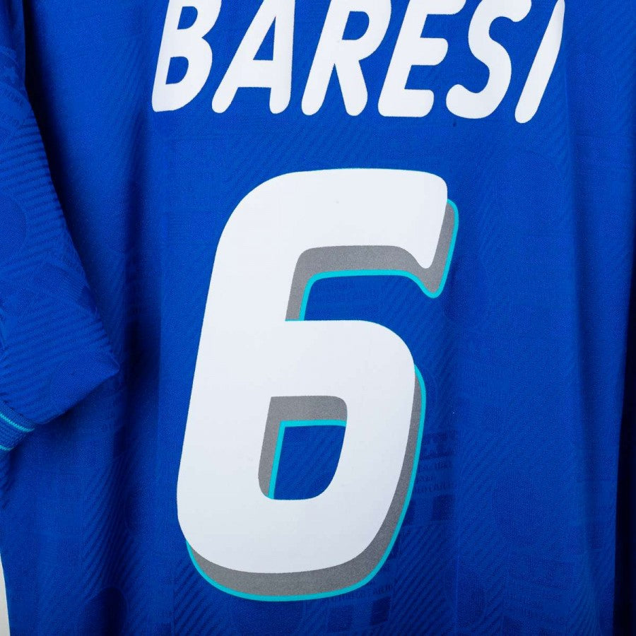 Italy home shirt worn at the 1994 World Cup in the USA, produced by Diadora. Classic blue with jacquard pattern featuring FIGC logos and football motifs. Polo collar with tricolour details, embroidered Diadora logo on the right chest and stitched FIGC badge with three stars on the left chest. Number 6 printed on the front and back with shadow effect, Baresi name printed on the reverse. Lightweight breathable fabric. An iconic shirt from the 1994 World Cup, worn in the final against Brazil. Size L.