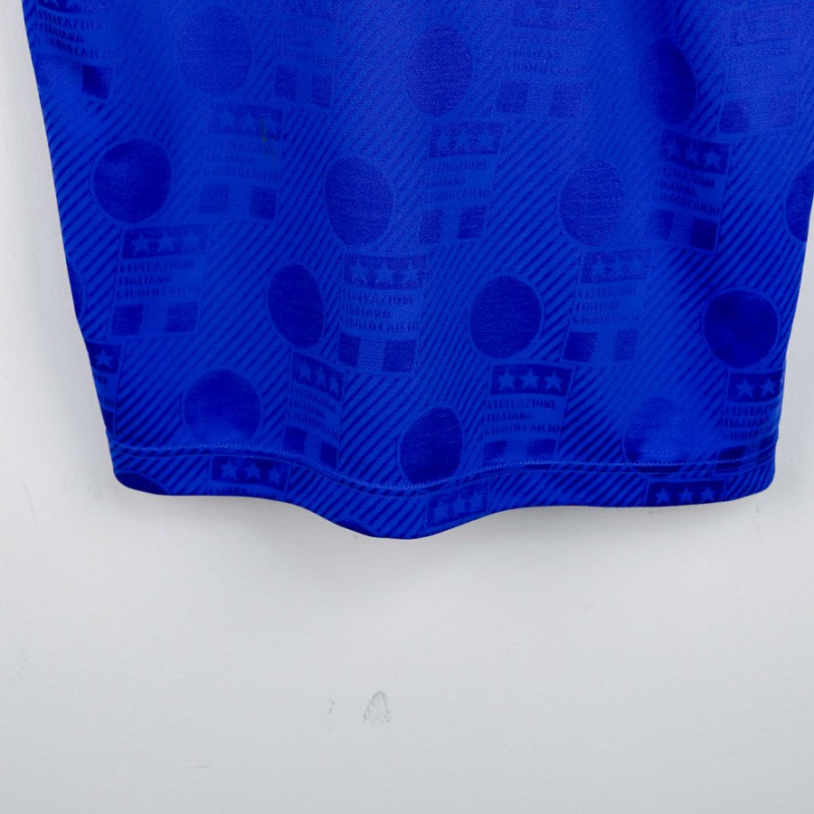 Official Italy National Team jersey for the USA 1994 World Cup, produced by technical sponsor Diadora and personalized with the name and number of the legendary Paolo Maldini. This blue jersey, with the number 5 on the front and back, features iconic details like the colors of the Italian flag on the collar and sleeve edges. The FIGC badge with three stars is stitched on the chest, celebrating Italy's World Cup victories.