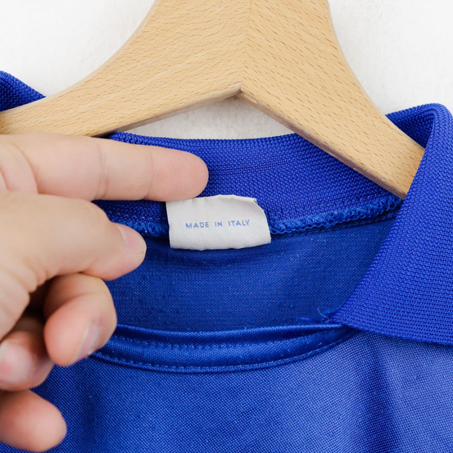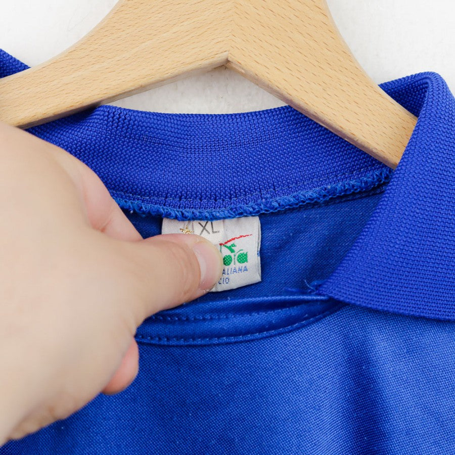 1989 Home Italy Shirt Diadora LS. Classic long-sleeve shirt of the Italian National Team, crafted by Diadora with no commercial sponsors, reflecting the minimal style of the era. Features the stitched FIGC crest and a collar with tricolor accents. Size XL shown on the label.