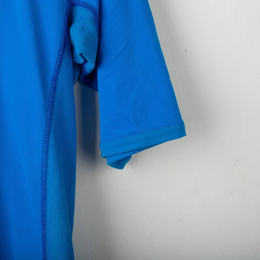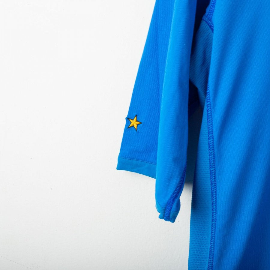 Official Italy national team home shirt from the 2002 season, made by Kappa for Fabio Cannavaro, number 5. Tight-fit blue design with side mesh panels and tonal accents. Features the Italy crest on the chest and Kappa logos on both sleeves. Three gold stars on the shoulders. Name "CANNAVARO" and number 5 on the back. Size XL. Good overall condition with light signs of wear. Original vintage piece.