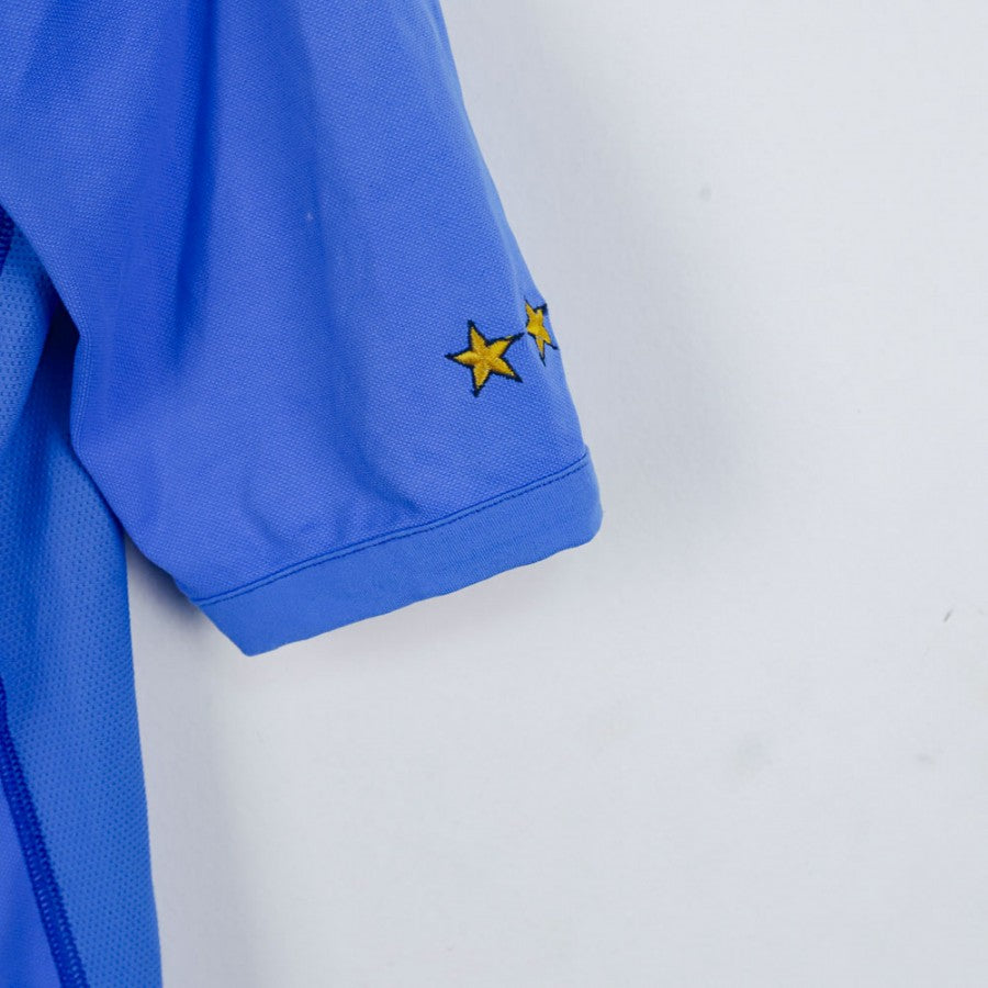 Official Italy Home jersey for the 2002 World Cup, produced by Kappa. This size M jersey features a clean design with the number 10 printed on both the front and back and Totti’s name on top. The FIGC badge is stitched on the chest, and golden stars on the sleeves celebrate Italy’s World Cup victories. The stretchy Kappa fabric ensures a slim fit designed for athletic performance.
