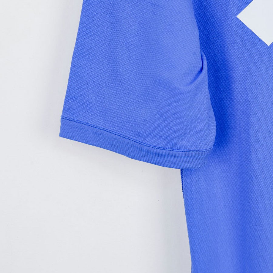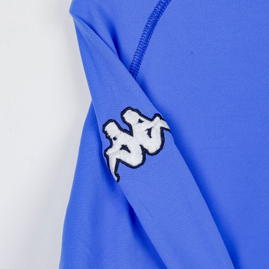 Official Italy home jersey for the 2002 World Cup, made by Kappa and featuring Francesco Totti’s name and number 10. The jersey is in the classic Azzurri blue, with the FIGC badge on the left chest and the number 10 printed in white at the center. The sleeves showcase the Kappa logo and two gold stars representing Italy’s World Cup victories. On the back, Totti’s name and number 10 are printed in white, paying tribute to the legendary Roman playmaker, renowned for his vision and powerful shots.