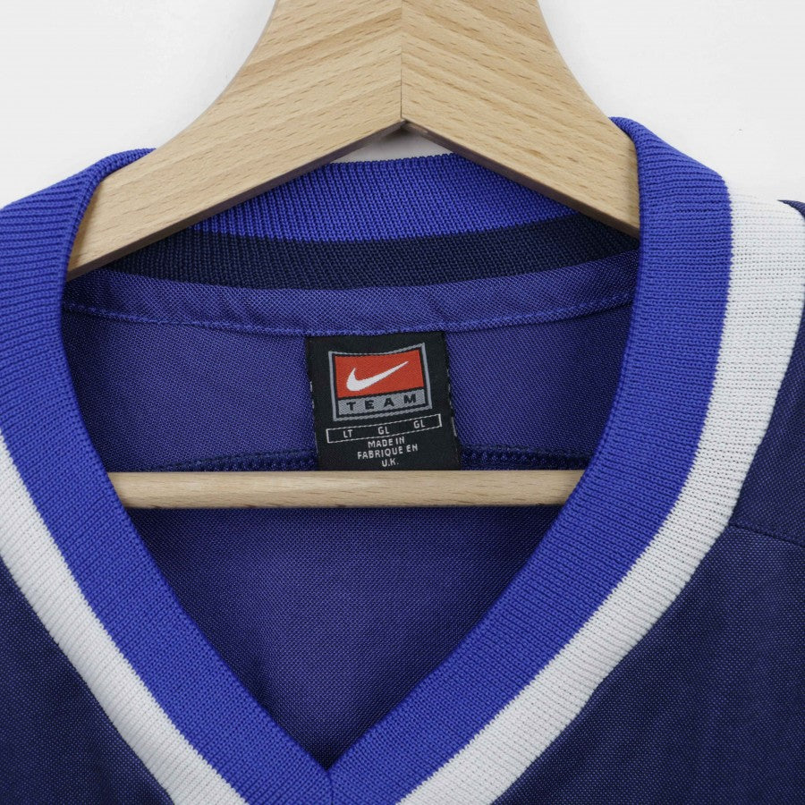 1998 Italy Nike Home Jersey, player Meoni number 2, from the France World Cup. Classic blue with white inserts, Nike logo, tricolor badge, and red number. A rare vintage piece for football fans and collectors.