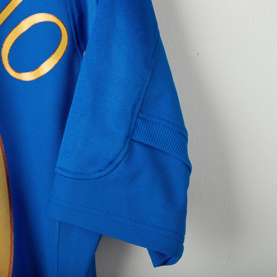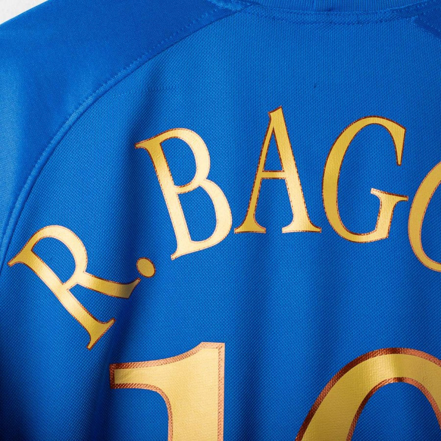 Italy national team home shirt from the 2004 season, made by Puma and customized with the name Roberto Baggio and number 10. Light blue base with gold details. Features Puma logos on the chest and sleeves and the FIGC crest with three stars. “R. BAGGIO” and number 10 on the back in gold. Short sleeve model with ribbed crew neck. Faded inner label. Size M.