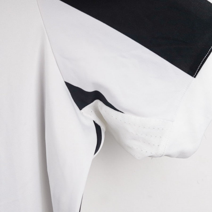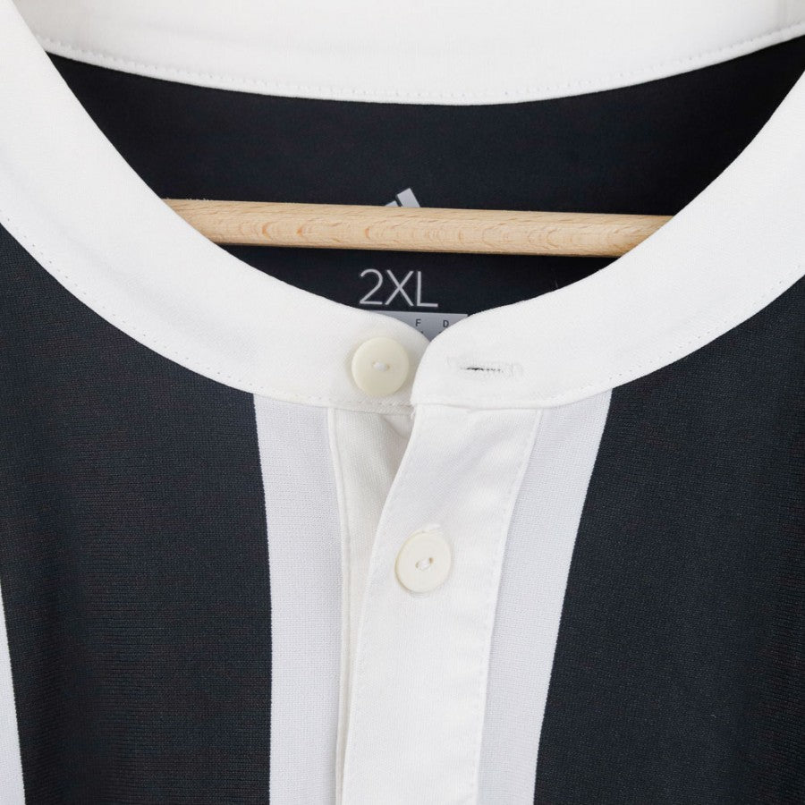 Official Juventus home shirt for the 2017/2018 season, made by Adidas. It features the classic black and white striped design with a round-neck collar and button closure. The chest displays the Adidas logo, Juventus’ new crest, the Scudetto, and the Coppa Italia badge. The Jeep logo is printed in black across the center, with Adidas’ iconic three stripes running down the sides. Size 2XL.