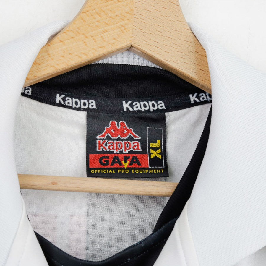1998/1999 Home Juventus Shirt Del Piero 10. This iconic black and white striped jersey by Kappa features the number 10 and "Del Piero" in bold red on the back. The technical sponsor Kappa is present on the chest and sleeves, with the D+ Libertà Digitale commercial sponsor in the center. The Juventus crest with two stars is stitched on the sleeve. Size XL.