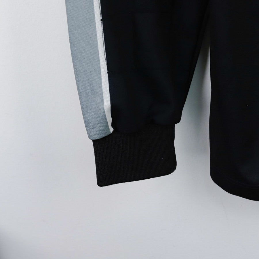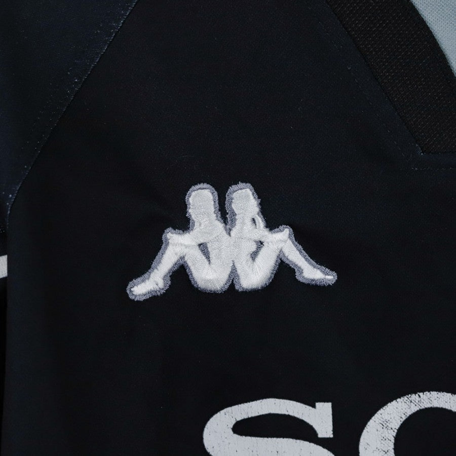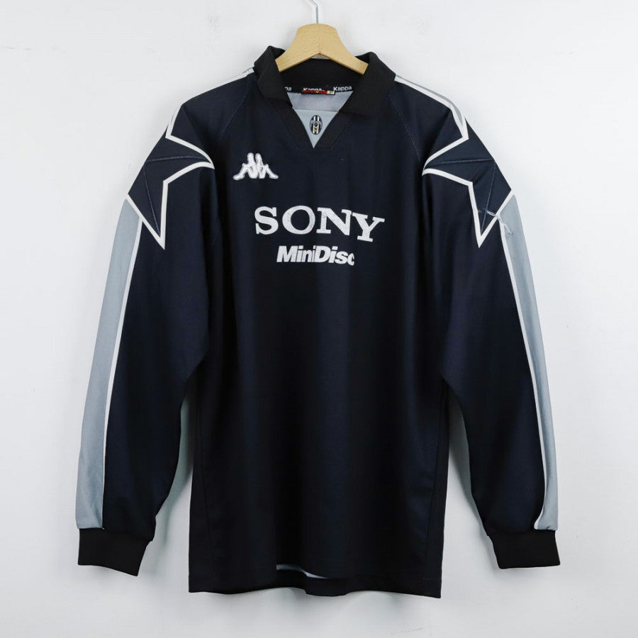 Official Juventus Home jersey, season 1997/1998, produced by technical sponsor Kappa. Black with gray details and stars on the shoulders, the jersey features the iconic Sony MiniDisc sponsor on the chest. The back is personalized with "Peruzzi" and the number 1, honoring legendary goalkeeper Angelo Peruzzi. This iconic long-sleeve jersey, with padded details, is perfect for collectors and Juventus fans.