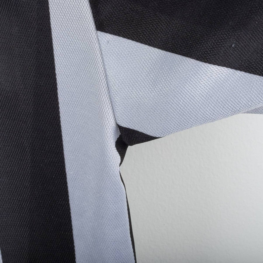 Juventus home shirt from the 1995/1996 season, produced by Kappa in the “Gara – Official Pro Equipment” line. Classic black and white stripes with white polo collar and black trim. Embroidered Kappa logo on the chest, Juventus crest with two stars stitched on the left chest, and Sony sponsor printed across the front. On the back, Ravanelli 11 printed name and number with Kappa logo in the number. Lightweight breathable fabric, typical ‘90s design. A historic shirt from the season crowned with the Champions League victory in Rome against Ajax. Size L.