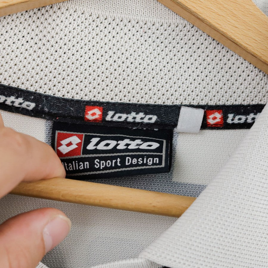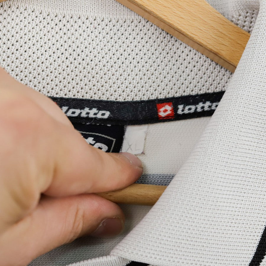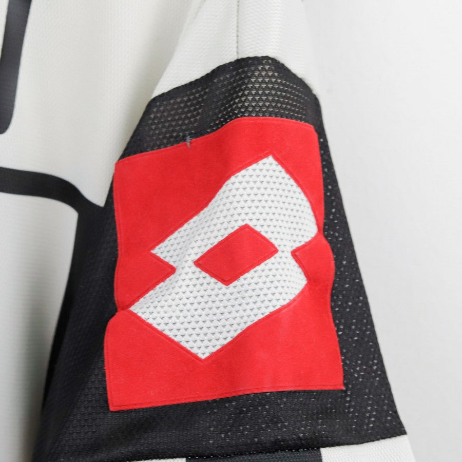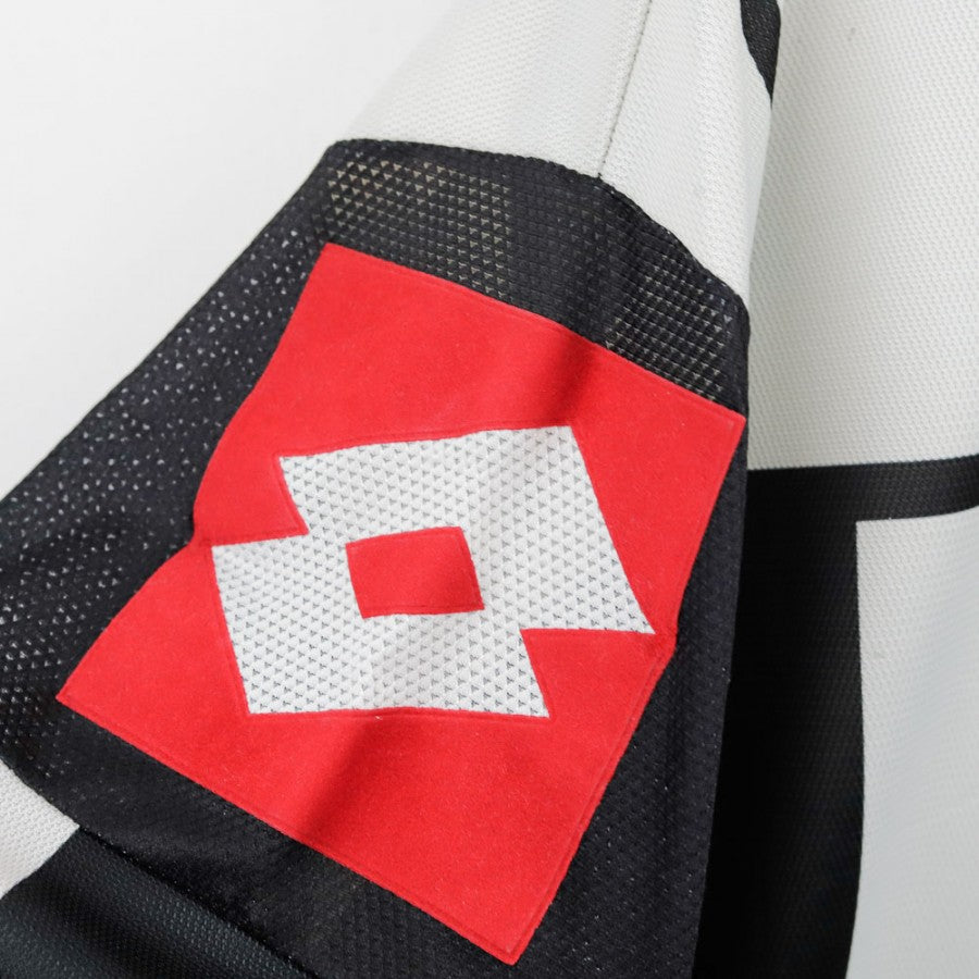 Home Juventus shirt made by Lotto for the 2001/2002 season, size XL. Features the traditional black and white vertical stripes, club crest with two stars, Lotto technical sponsor, and Fastweb commercial sponsor. The back is customized with Trezeguet’s name and number 17.