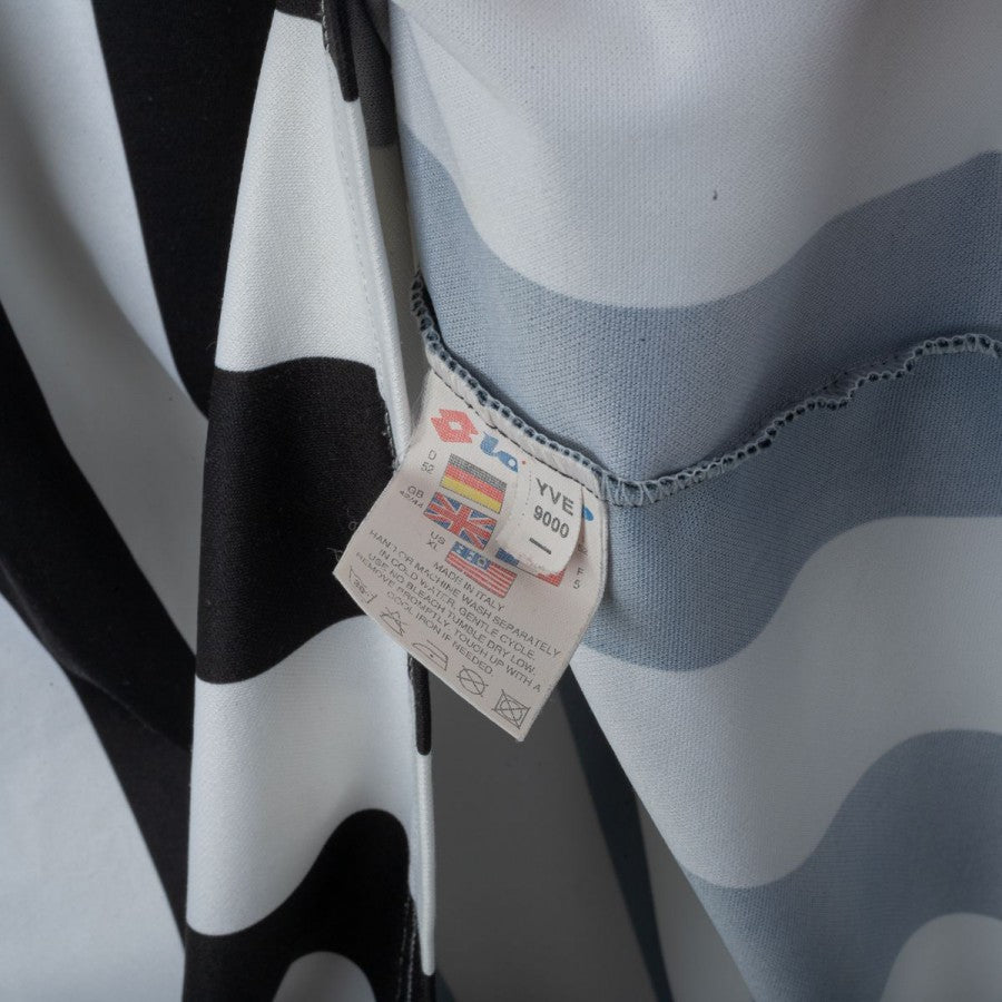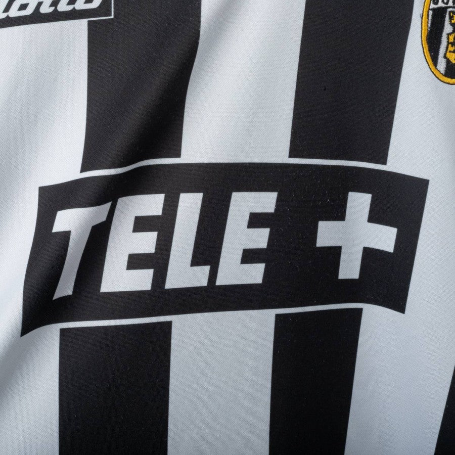 2000/2001 Home Juventus Shirt Lotto Zidane 21. Made by Lotto, this classic Juventus shirt features the TELE+ sponsor at the center, Lotto logos on the chest and sleeves, and the club crest with two stars. The design includes bold black and white stripes and a white polo collar with black trim. Zidane’s name and number 21 appear on the back.