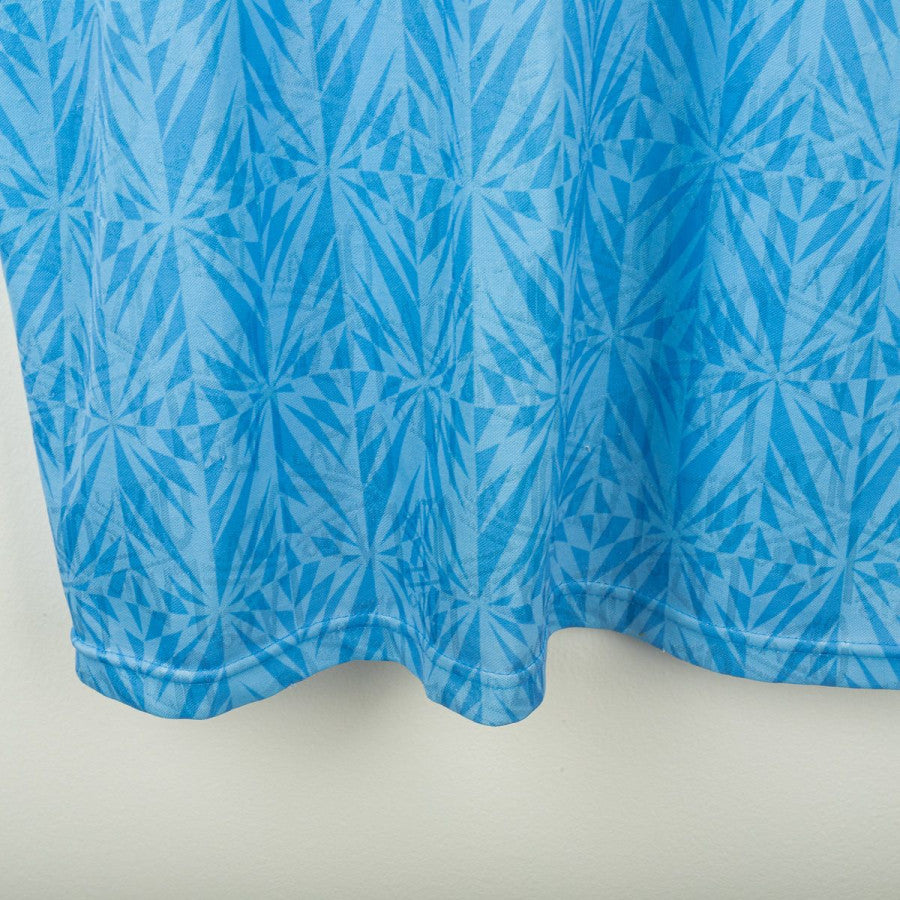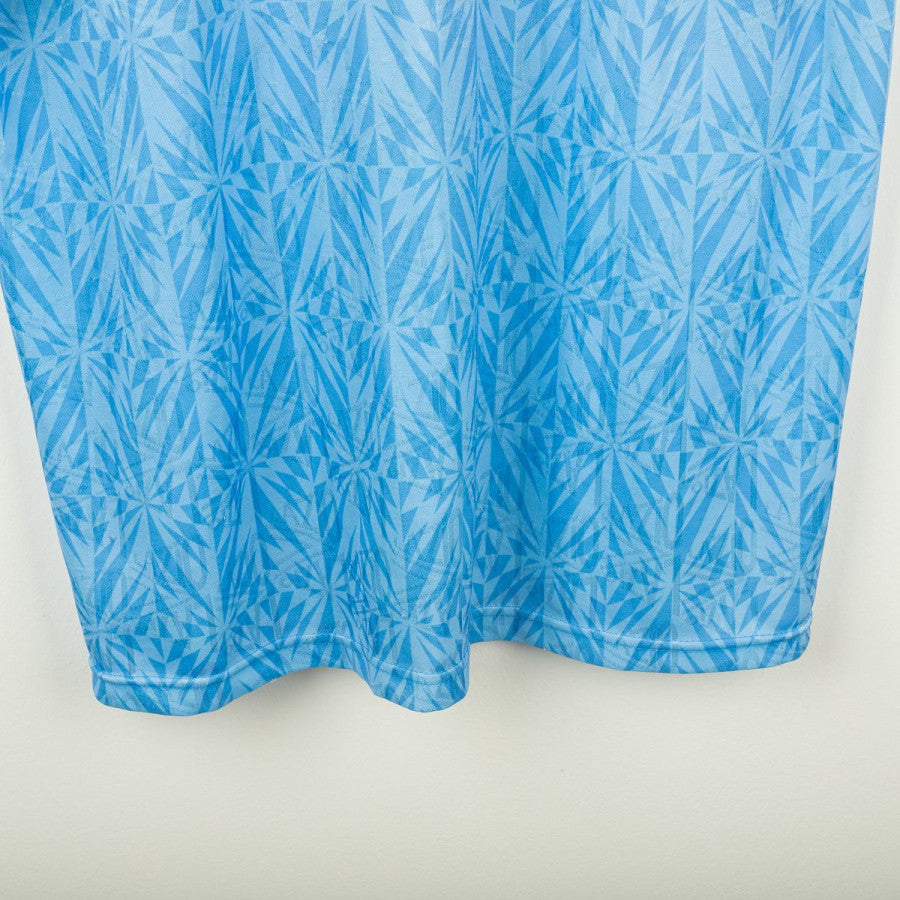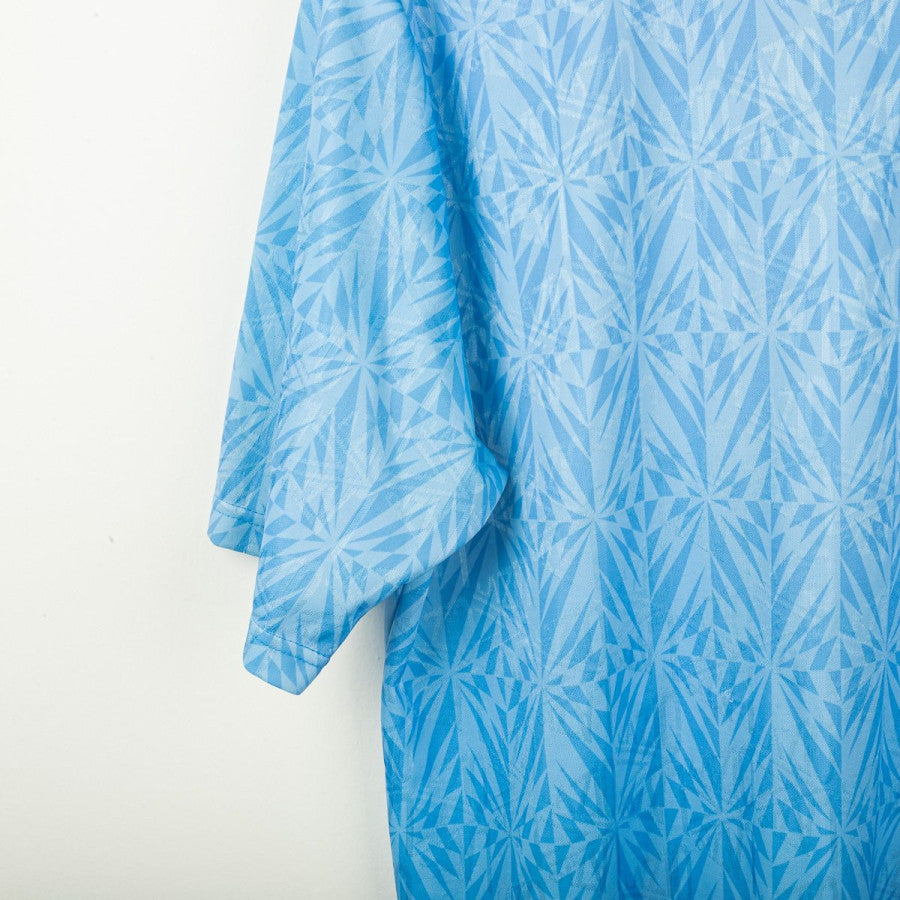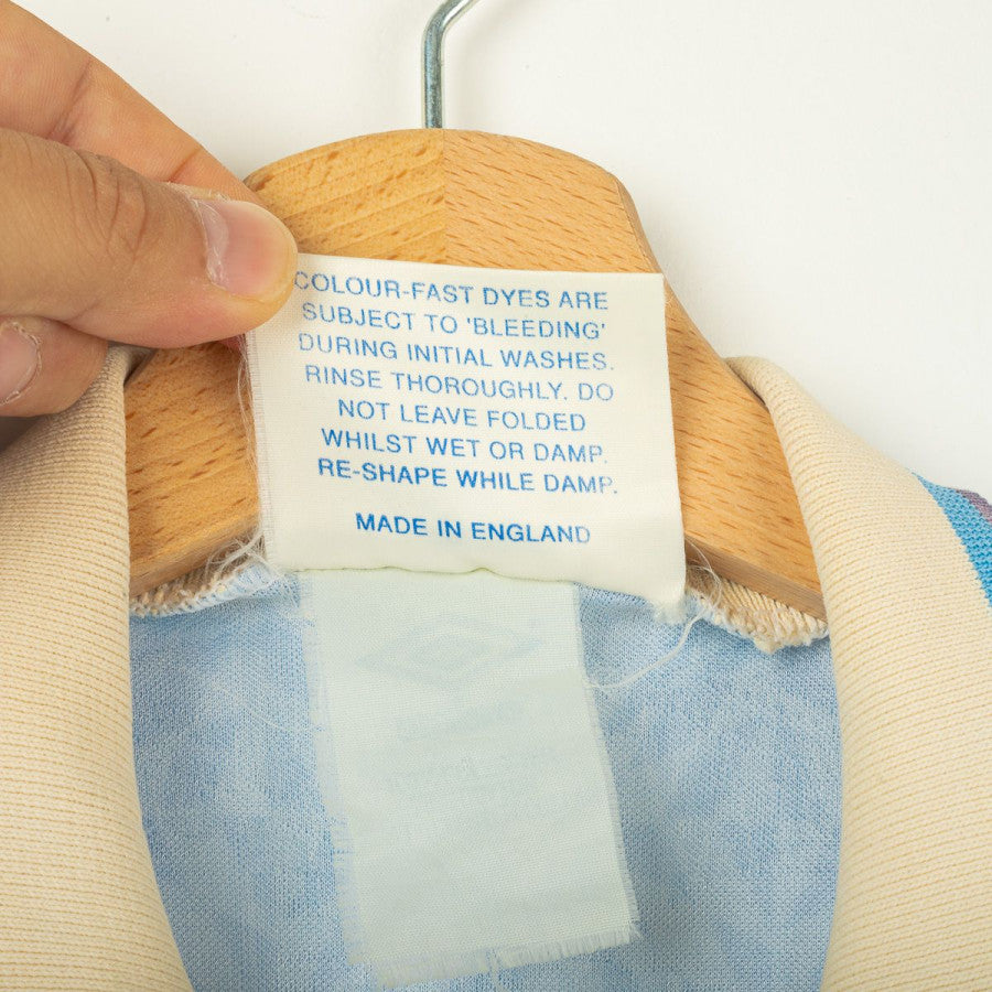 Lazio home shirt from the 1991/1992 season, made by Umbro. Light blue base with geometric pattern and polo collar with button closure. Embroidered Umbro logo on the right chest, Lazio crest applied on the left, and Banco Santo Spirito sponsor printed in the center. Made in England from shiny polyester with regular fit. A true vintage classic and one of Lazio’s most iconic 90s designs. Size L.