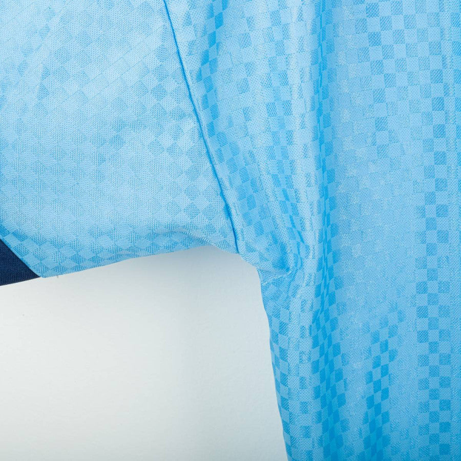 Official S.S. Lazio Home shirt from the 1995/1996 season, made by Umbro and worn by Argentine defender José Chamot. Classic sky blue design with navy details on the collar and cuffs, Umbro logo and “Banca di Roma” sponsor on the chest. Embroidered Lazio crest on the left side. Made from lightweight technical fabric with a glossy geometric pattern typical of the ’90s. Name and number “CHAMOT 6” printed on the back. Size Medium.
