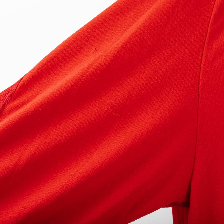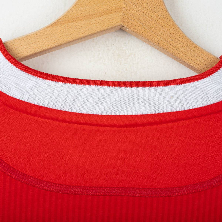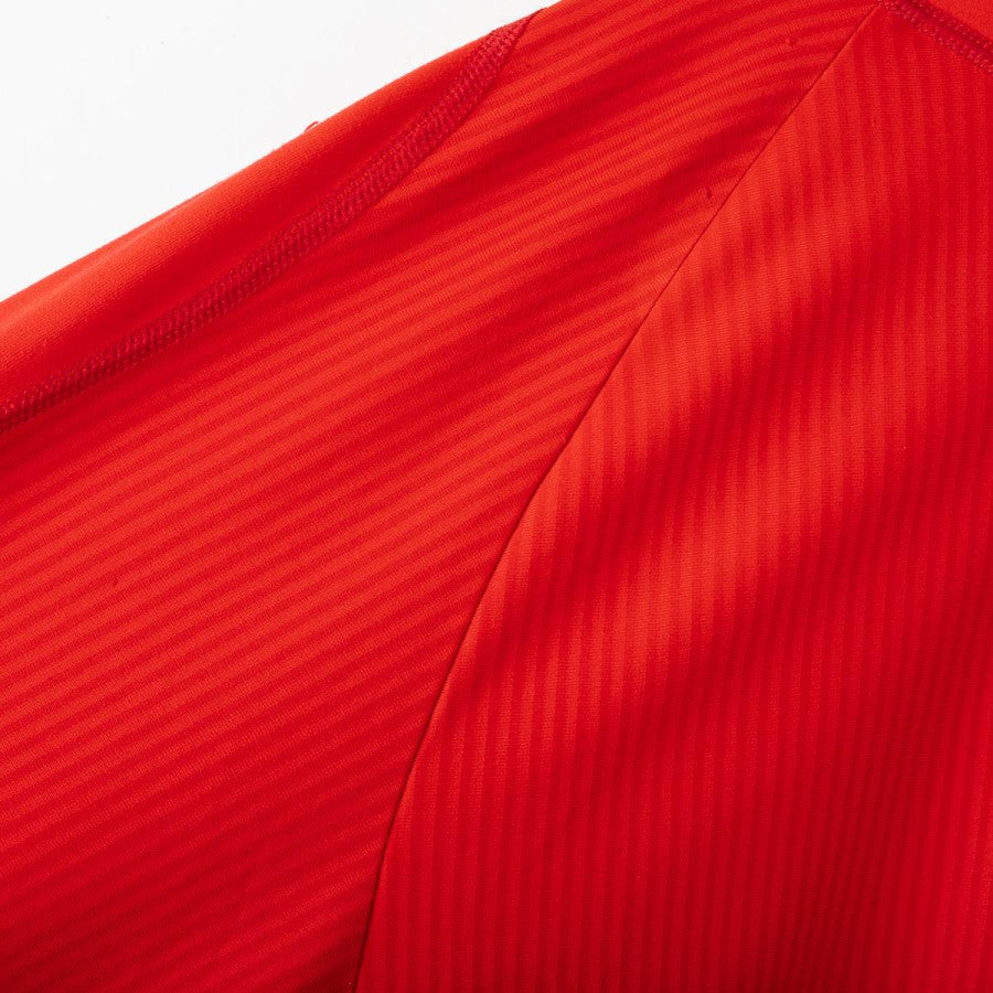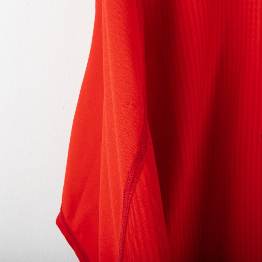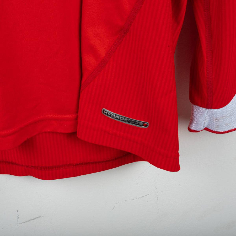 Liverpool home shirt from the 2002/2003 season, made by Reebok. Red with white details on collar and cuffs. Stitched club crest on left chest. Rubberised Reebok logo on chest. “Carlsberg” sponsor in white flock. “OWEN” name and number 10 printed on the back in white with black outline and official Premier League logo at base of number. Long sleeves with V-neck collar. Size L.