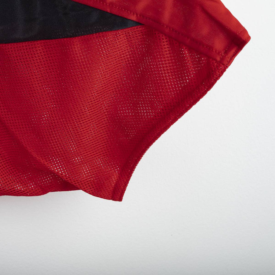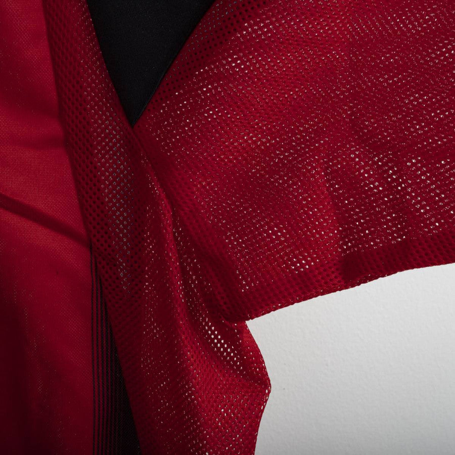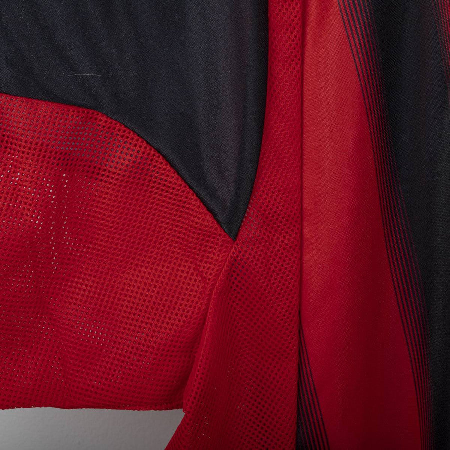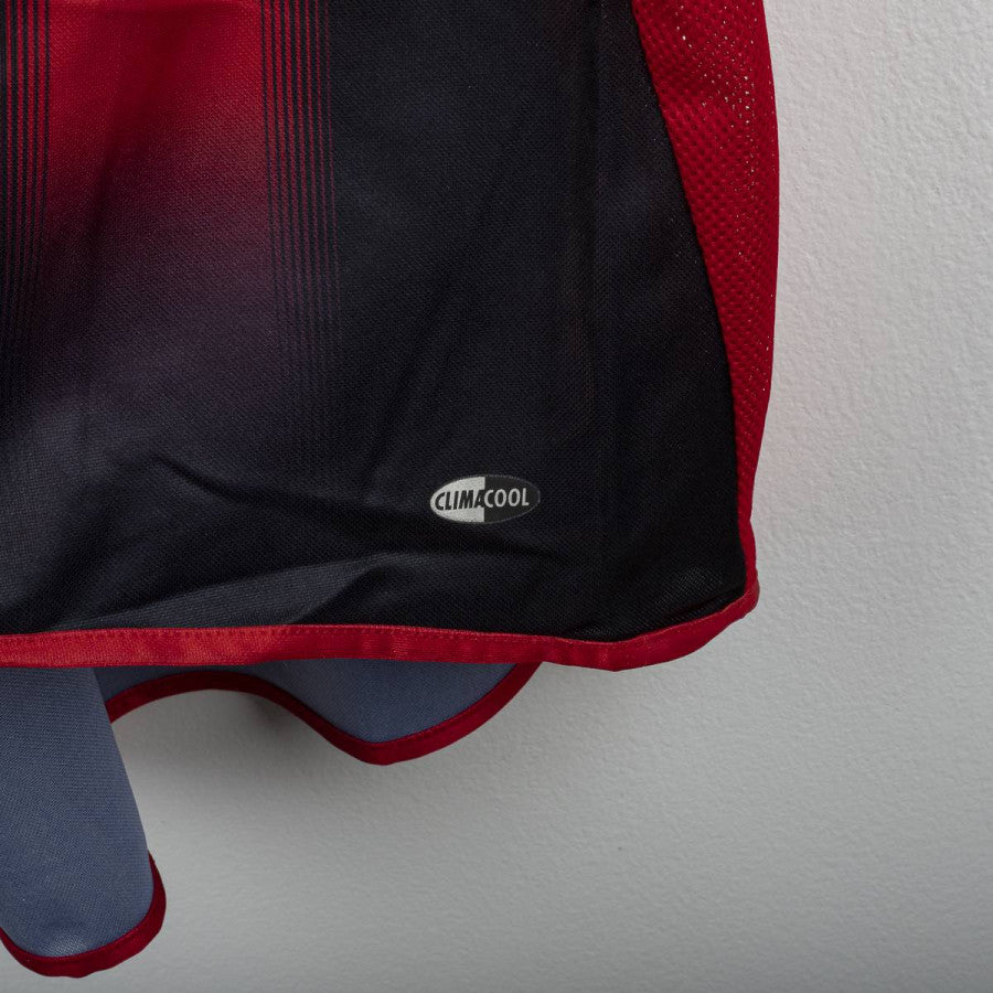 AC Milan home shirt from the 2004/2005 season, made by Adidas. Classic red and black stripes with black V-neck collar. Embroidered Milan crest with golden star on the left chest, Adidas logo stitched in white on the right. Opel sponsor printed on the front. Kaká name and number 22 printed in gold with black outline on the back. Regular fit. Size XL.