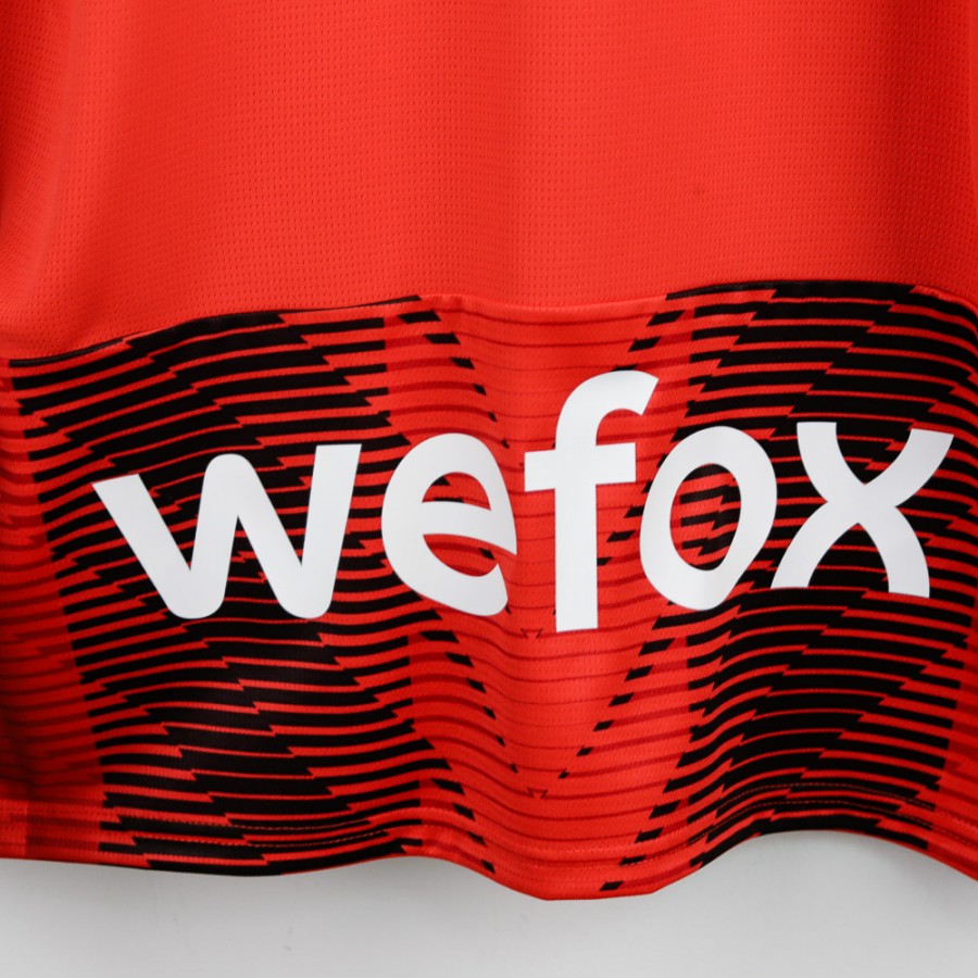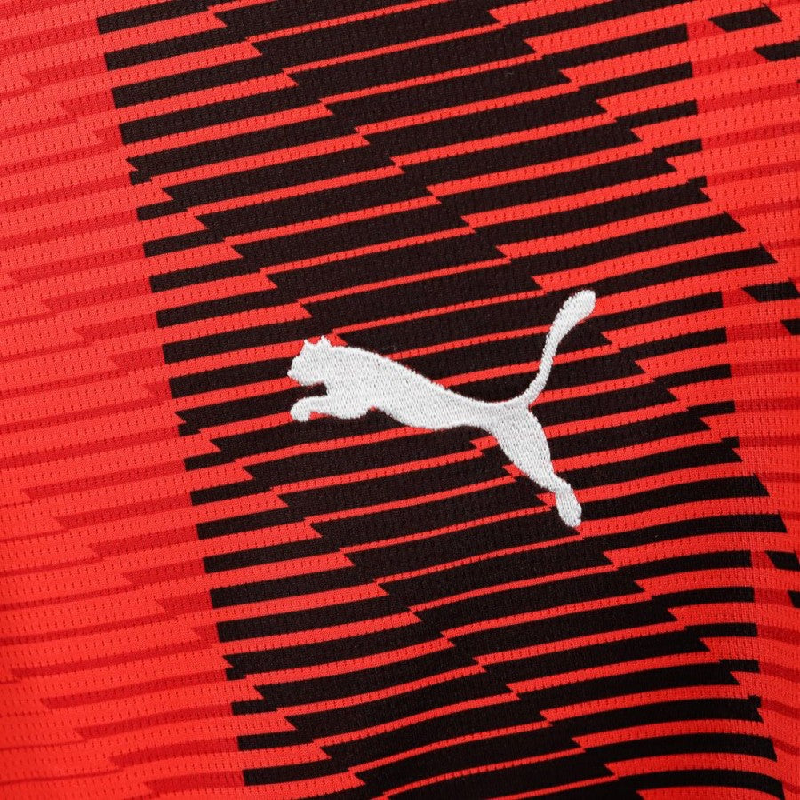 AC Milan long-sleeve home shirt from the 2023/2024 season made by Puma. Features a bold red base with a striking black diagonal line pattern, black cuffs and collar. On the front are the Puma logo as technical sponsor and Emirates Fly Better as commercial sponsor. The back displays Theo and number 19 in black with a light outline. Right sleeve features the official Serie A patch, and Wefox is present as secondary sponsor on the lower back. Size M.
