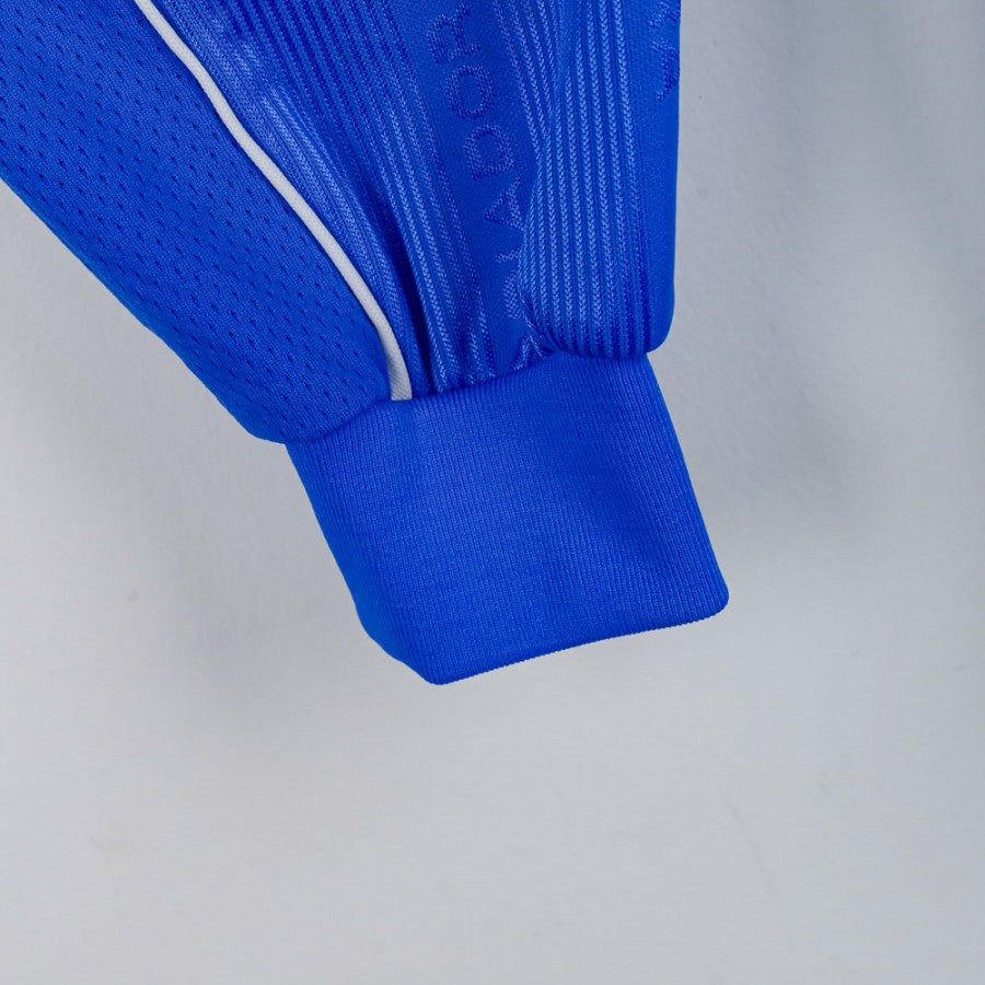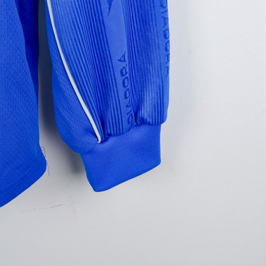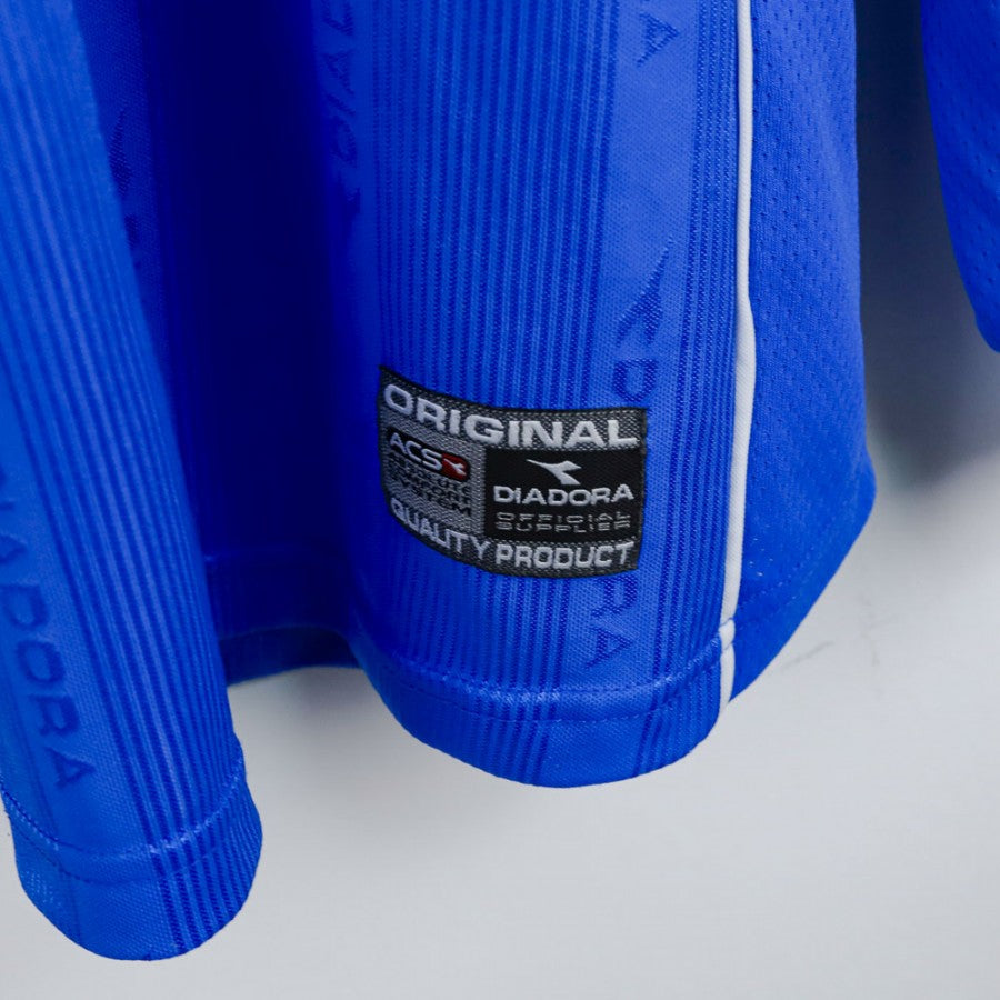 Official Napoli Home jersey from the 2000/2001 season, produced by technical sponsor Diadora. This long-sleeve model in light blue features a vertical texture with repeated Diadora logos. The SSC Napoli crest is embroidered on the left chest, while the Diadora logo is stitched on the right. The commercial sponsor Peroni is printed in white with its classic red logo at the center. The polo collar with white and navy blue accents adds a touch of elegance. Made of breathable technical fabric, this jersey is ideal for collectors and fans. Size XL.
