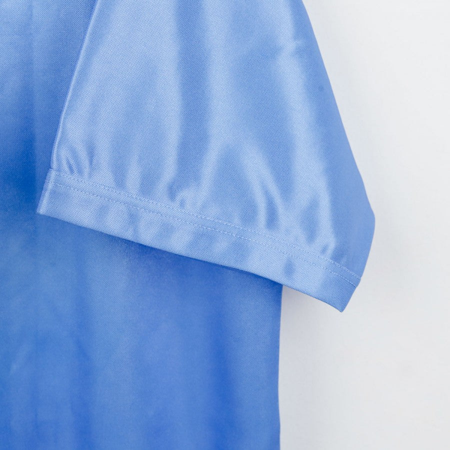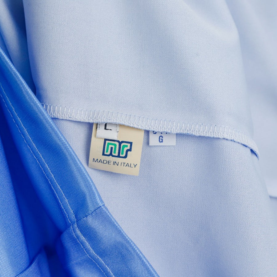 Official Napoli home shirt made by technical sponsor Ennerre for the 1990/1991 season. The classic sky-blue design features a polo collar with a V-neck closure. On the chest, the Ennerre logo is displayed alongside the tricolor badge for the previous season's Scudetto win and the Mars sponsor in white with a blue outline. The right sleeve features the Società Sportiva Calcio Napoli logo. The back of the shirt has the number 5 in white with a blue border. The indicated size is L.