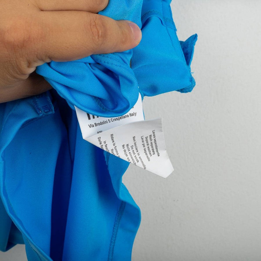 Napoli home jersey from the 2012/2013 season made by Macron. Special edition worn in the Italian Cup Final against Juventus on May 20, 2012, with dedicated embroidered patch on the chest. Light blue color with white details on collar and sleeves. Central sponsors "Lete" in red and "MSC" in navy applied in print. Embroidered Macron logo on the right chest and applied SSC Napoli crest on the left chest. "CAVANI" name and number 7 printed on the back in white with blue outline. Slim fit. Size S. Official Macron product, SSC Napoli technical supplier.