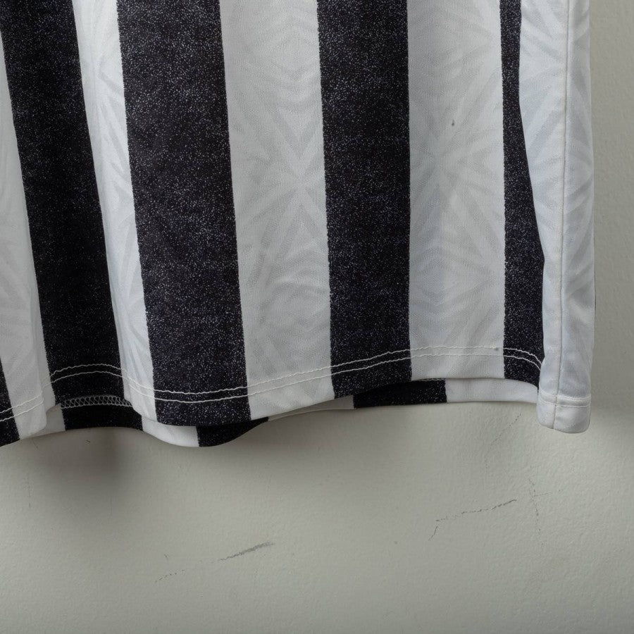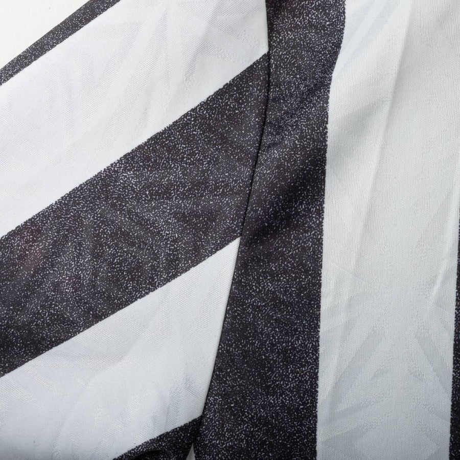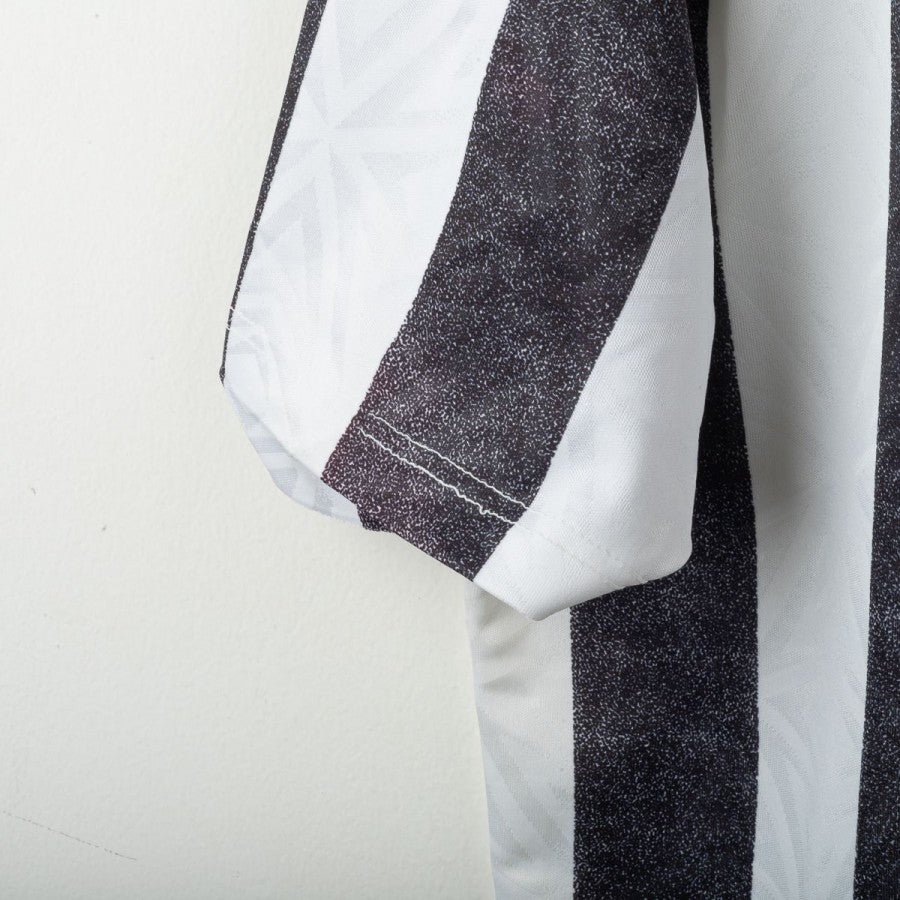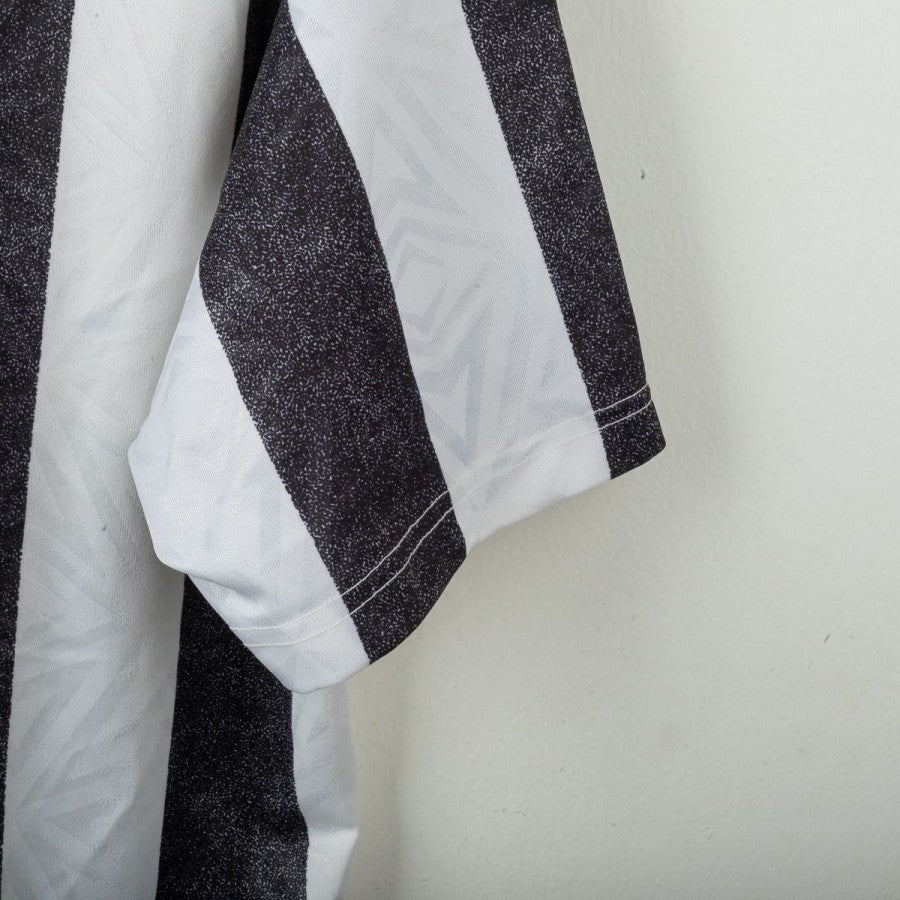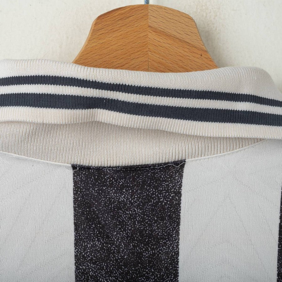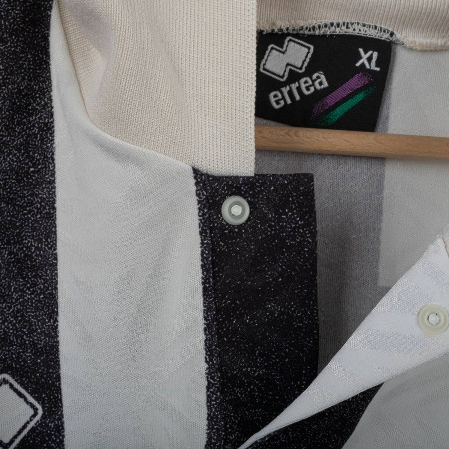 Home shirt of Nola from the 1994/1995 season made by Errea, featuring classic black and white vertical stripes. The technical sponsor Errea and the commercial sponsor Nusco Porte in Legno are displayed on the front. Number 3 on the back. Size XL.