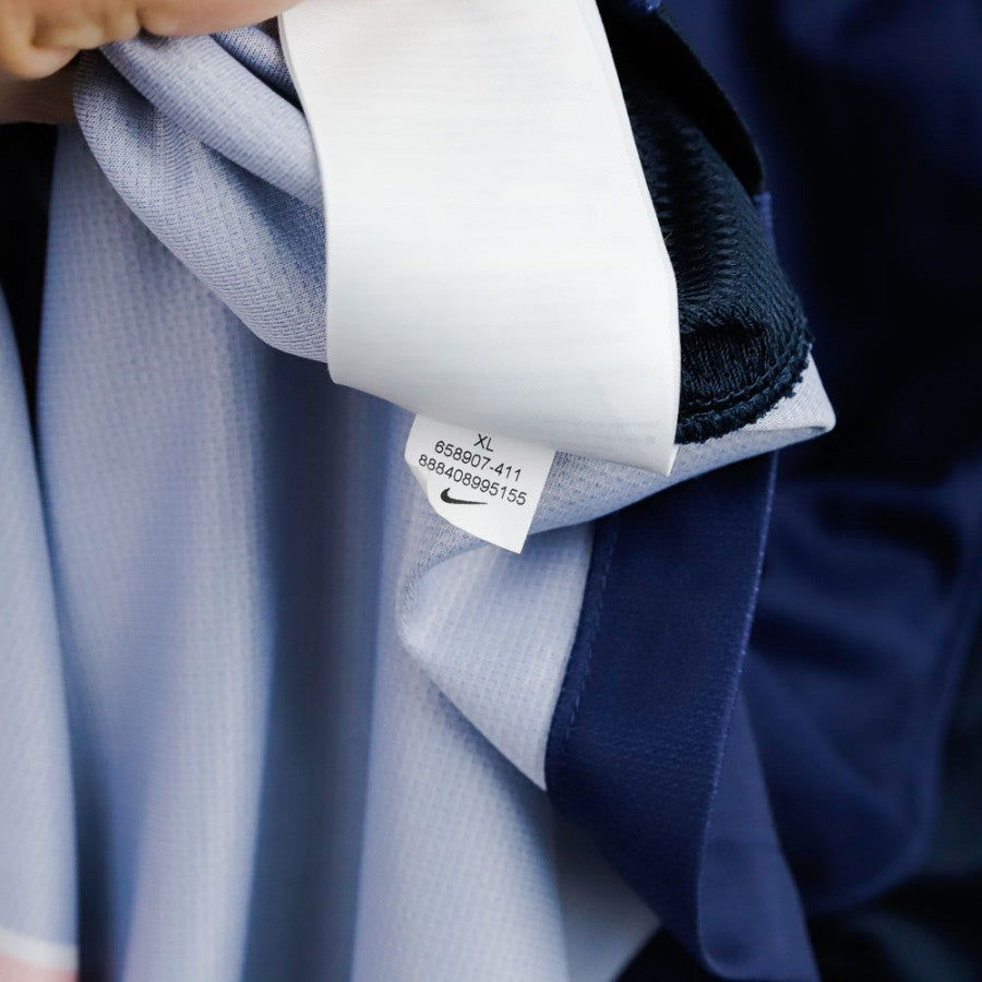 2014/2015 Home PSG Shirt Ibrahimovic 10. Made by Nike, it features the technical sponsor logo on the chest and the Fly Emirates commercial sponsor across the front. On the back, the shirt displays the name and number of PSG's Swedish legend, Zlatan Ibrahimović, number 10. Size is XL.