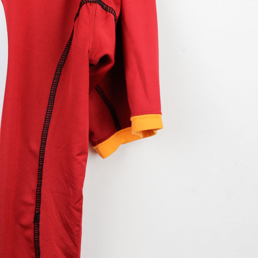 2001/2002 Home Roma Shirt Kappa Totti 10. Made by Kappa, this shirt features the club crest with tricolour scudetto, INA Assitalia sponsor, and Kappa logos on chest and sleeves. The design boasts a deep red base with orange trim and anatomical seam lines that follow the body shape. On the back appear Totti’s name and number 10. Size marked is XL.