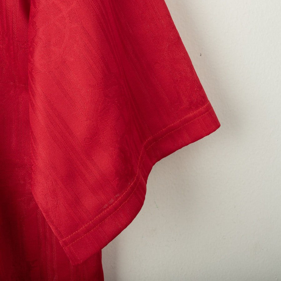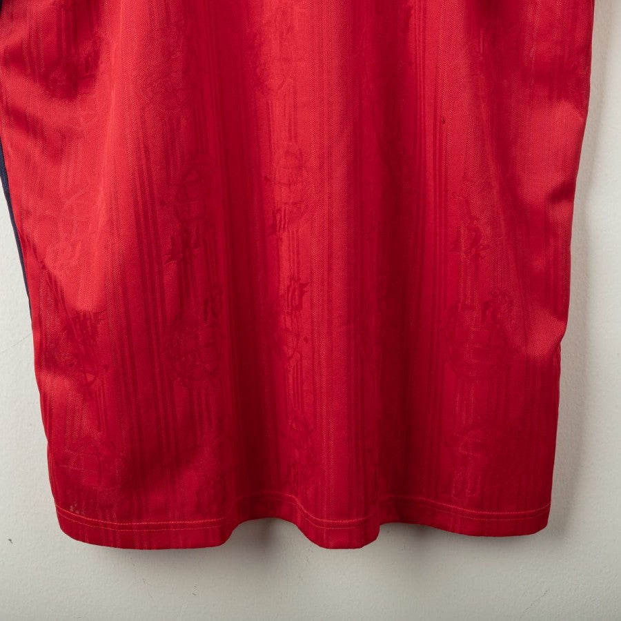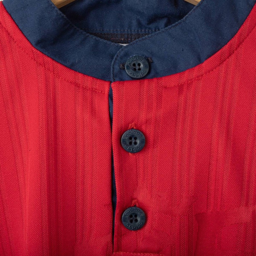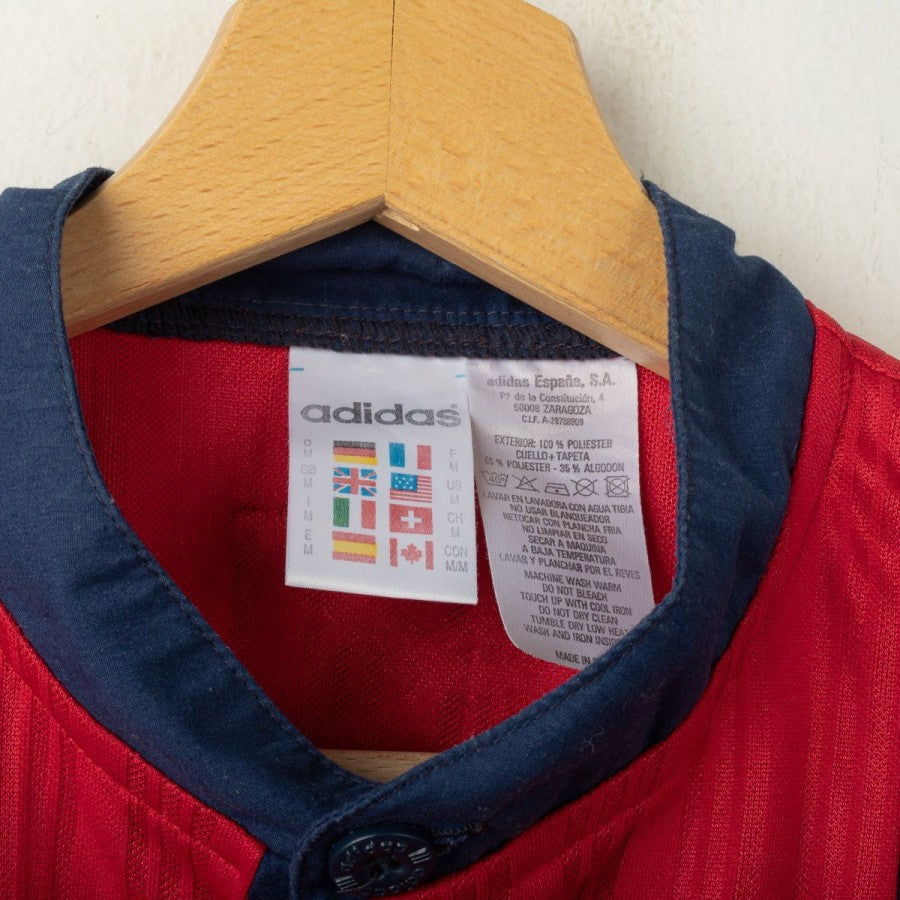 1996 Home Spain Shirt by Adidas, size M. This classic red shirt features a contrasting navy sleeve and vibrant yellow-red stripes running down the side. The Adidas logo is centered on the chest, while the Spanish football federation crest is proudly displayed on the heart side. The elegant button-up navy collar and subtle jacquard graphics give this shirt its unmistakable vintage flair. This model was used during Euro 1996 in England, where Spain was knocked out by the hosts in a dramatic penalty shootout.