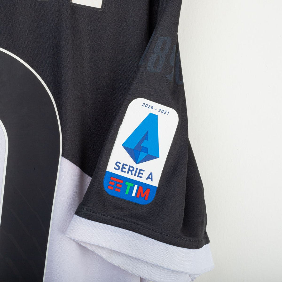 Udinese home shirt worn by Rodrigo De Paul during the 2020/2021 Serie A season, made by Macron. Classic black and white diagonal design, iconic of the club. Embroidered Macron logo on the right chest, stitched Udinese crest with “1896” on the left. Rubber-printed Dacia and Vortice sponsors on the front, Bluenergy on the back. “R. DE PAUL” name and number 10 in black plastic print with white outline. Official Serie A TIM 2020/2021 patch on the right sleeve. Inside collar reads “I Primi Bianconeri d’Italia”, with “La Passione è la nostra Forza” on the back. Size XL.