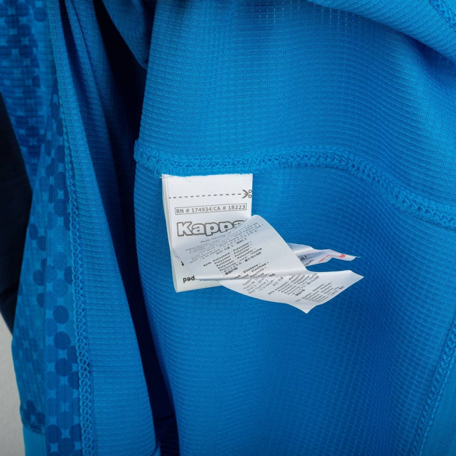 Napoli home shirt from the 2019/2020 season, UEFA Champions League edition, made by Kappa. Sky blue base with navy inserts and pixelated pattern on the front. Main sponsor Lete in rubberized print. Kappa logo printed on chest and sleeves. SSC Napoli crest in heat-applied rubber patch on the left chest. Official Champions League and Respect flock patches on sleeves. Name and number Mertens 14 in official white print on the back. Slim fit. Size M. Official Kappa product.