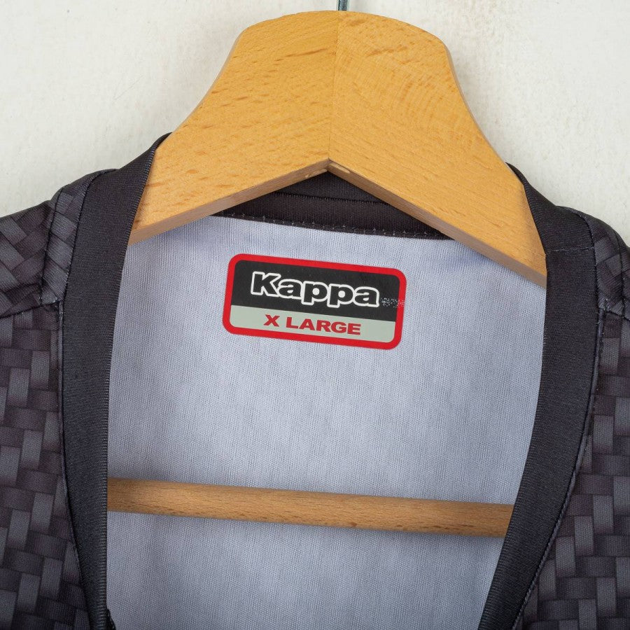 SSC Napoli third shirt from the 2017/2018 season, made by Kappa. Grey carbon-fiber effect design with honeycomb side panels. Printed Kappa logos on chest and sleeves, stitched Napoli crest on the left chest. Printed Lete and Garofalo sponsors on the front, Kimbo on the back. On the reverse, Hamsik name and number 17 in white print. Size XL.