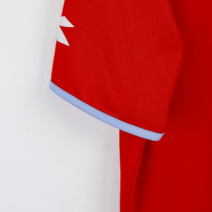 The official Napoli away jersey for the 2006/2007 season, produced by Diadora, features a vibrant red design with light blue details on the collar and sleeves. The club crest, stitched on the chest, is complemented by the commercial sponsor Lete at the center. The round neck and modern cut make it comfortable and functional. This jersey, in size L, commemorates a historic season as Napoli returned to Serie A.