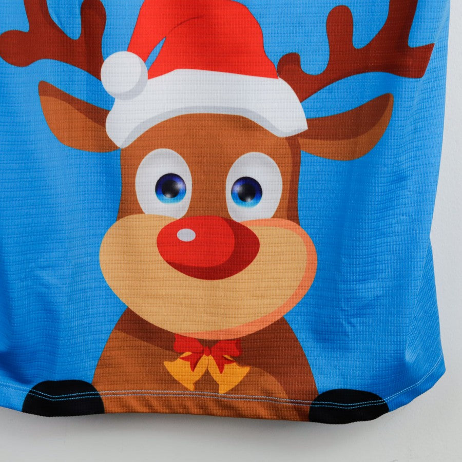 Official Napoli special edition jersey from the 2022/2023 season, made by technical sponsor EA7 Emporio Armani. The design features a sky blue base with red collar and sleeve trims, enriched by a Christmas-themed reindeer graphic on the front. The Napoli crest is stitched on the left chest, with the EA7 logo on the right. Commercial sponsors Lete and MSC are printed in the center. The back displays Kvaratskhelia’s name and number 77. Size: XL.