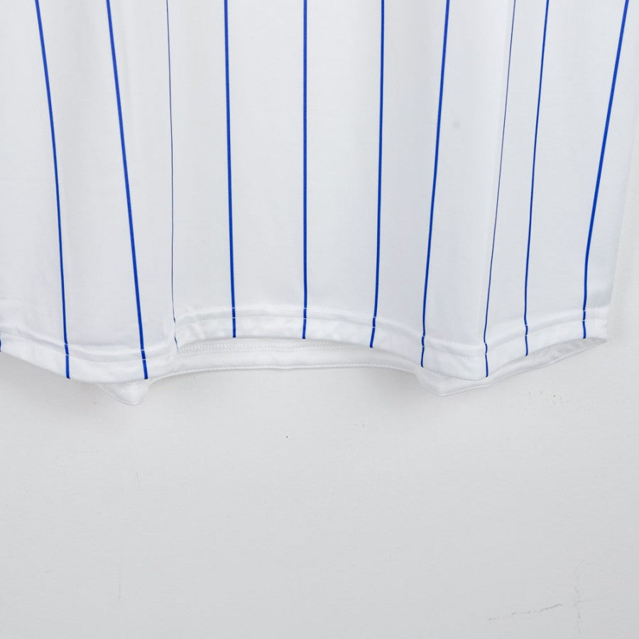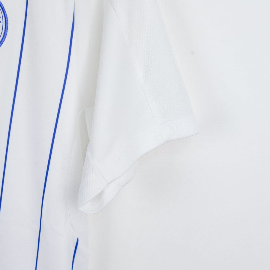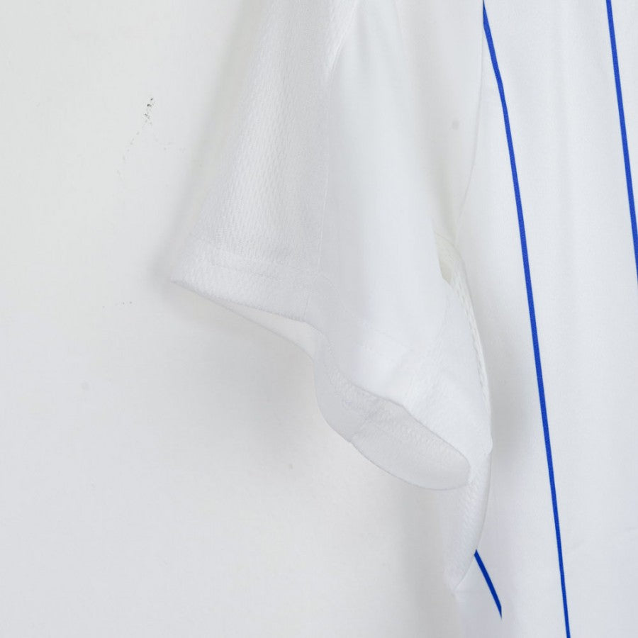 Official Leicester City Third jersey for the 2016/2017 season, in junior version. Produced by technical sponsor Puma, this white jersey with thin blue vertical stripes features an elegant and modern design. The club's crest is embroidered on the left chest, while the Puma logo appears on both sides of the chest. The commercial sponsor King Power is prominently displayed at the center, with the gold crown adding a distinctive touch.
