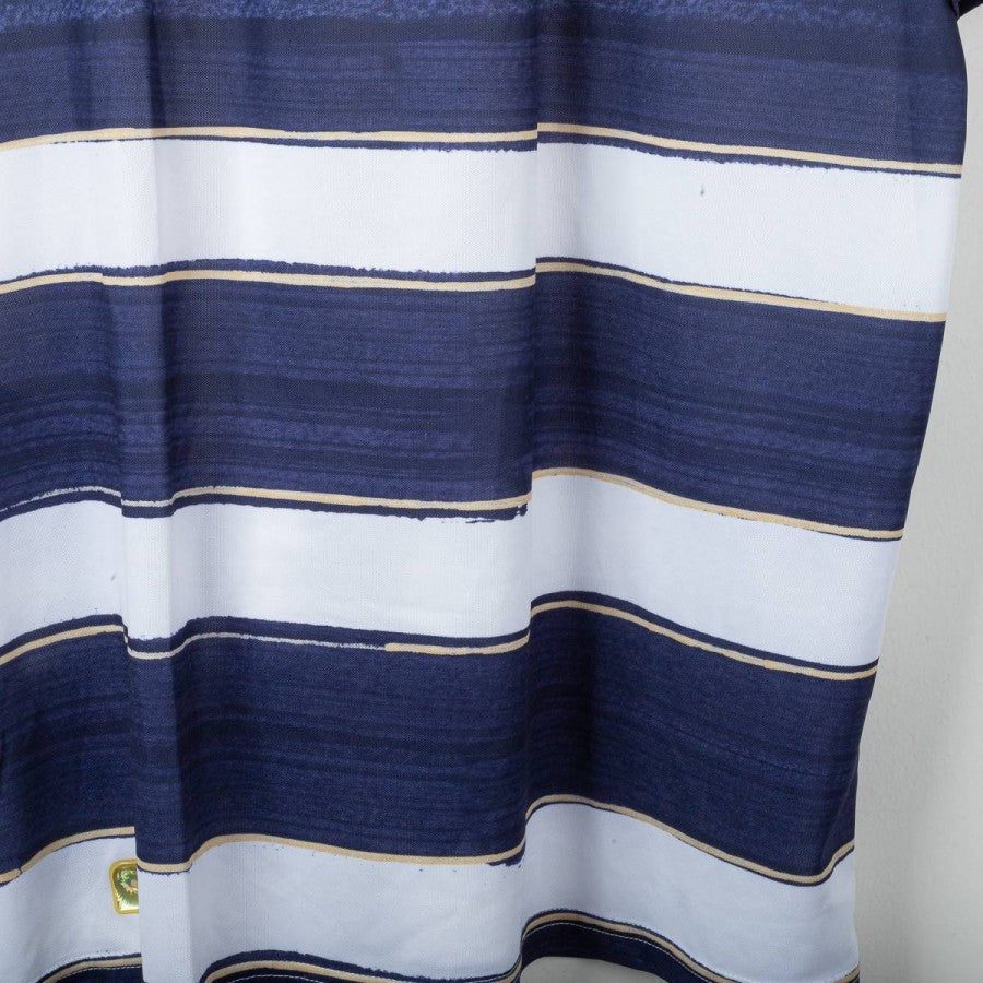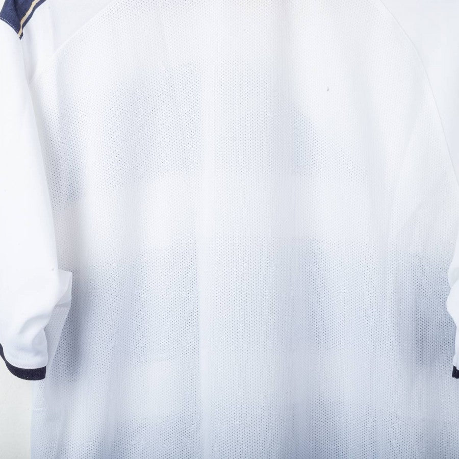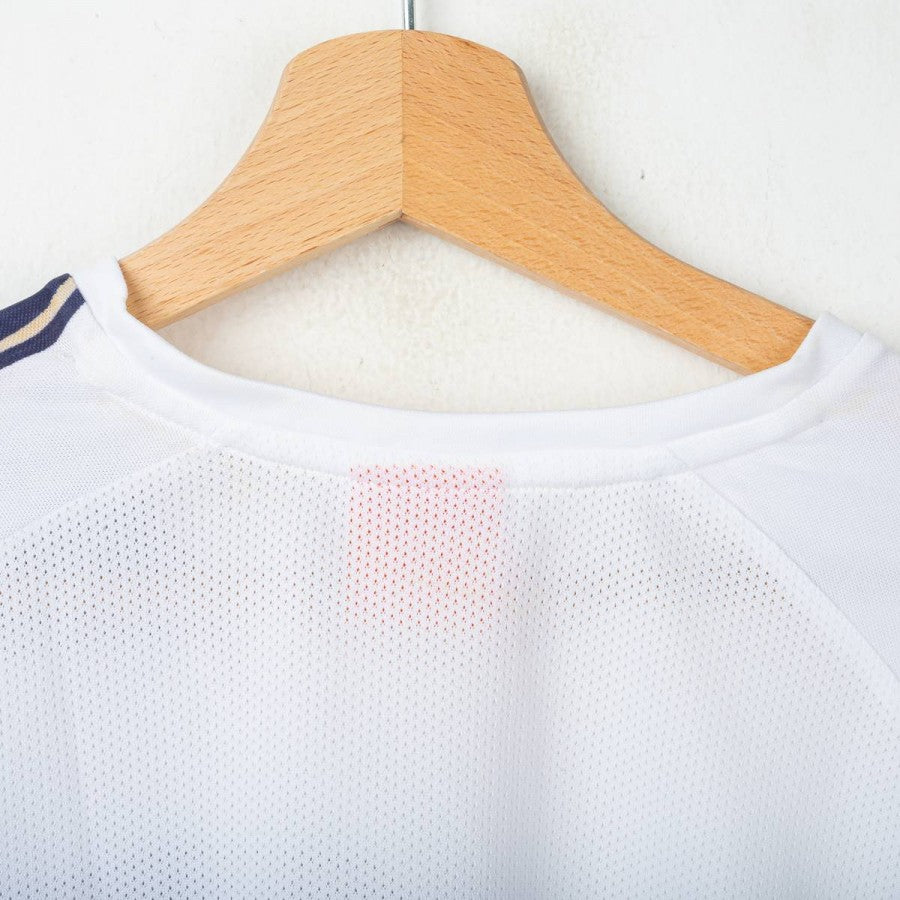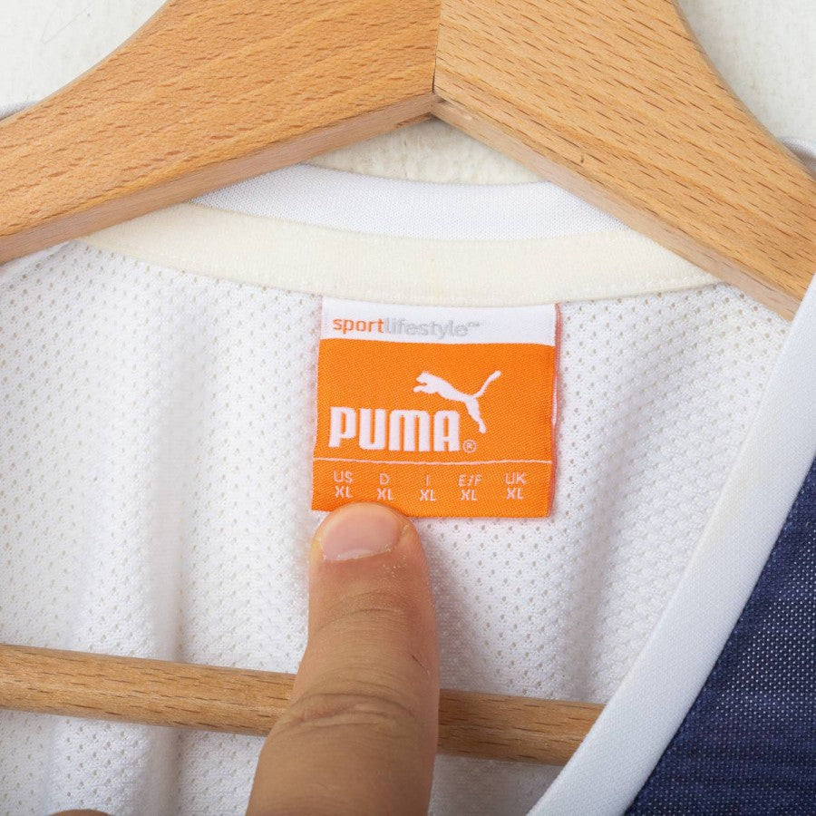 Lazio third shirt from the 2010/2011 season, made by Puma. White with large navy blue brush-stroke effect horizontal stripes and thin gold details. White embroidered Puma logo on the right chest and sleeves, stitched Lazio crest on the left. Regular fit. Size XL.