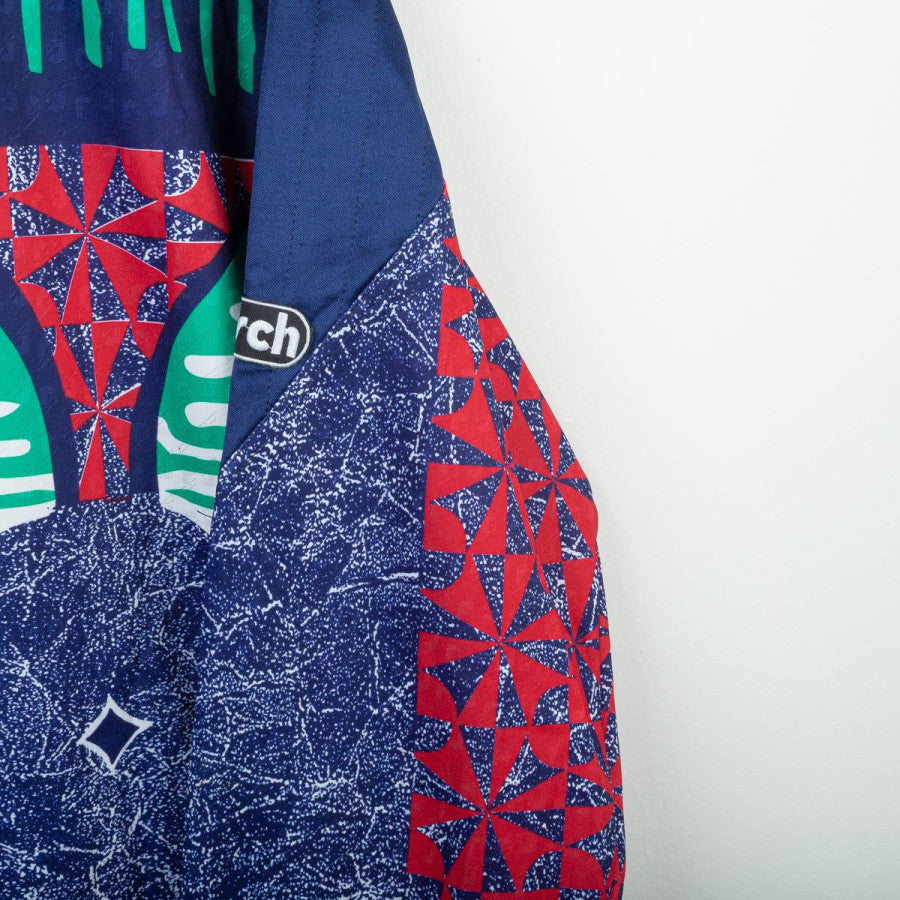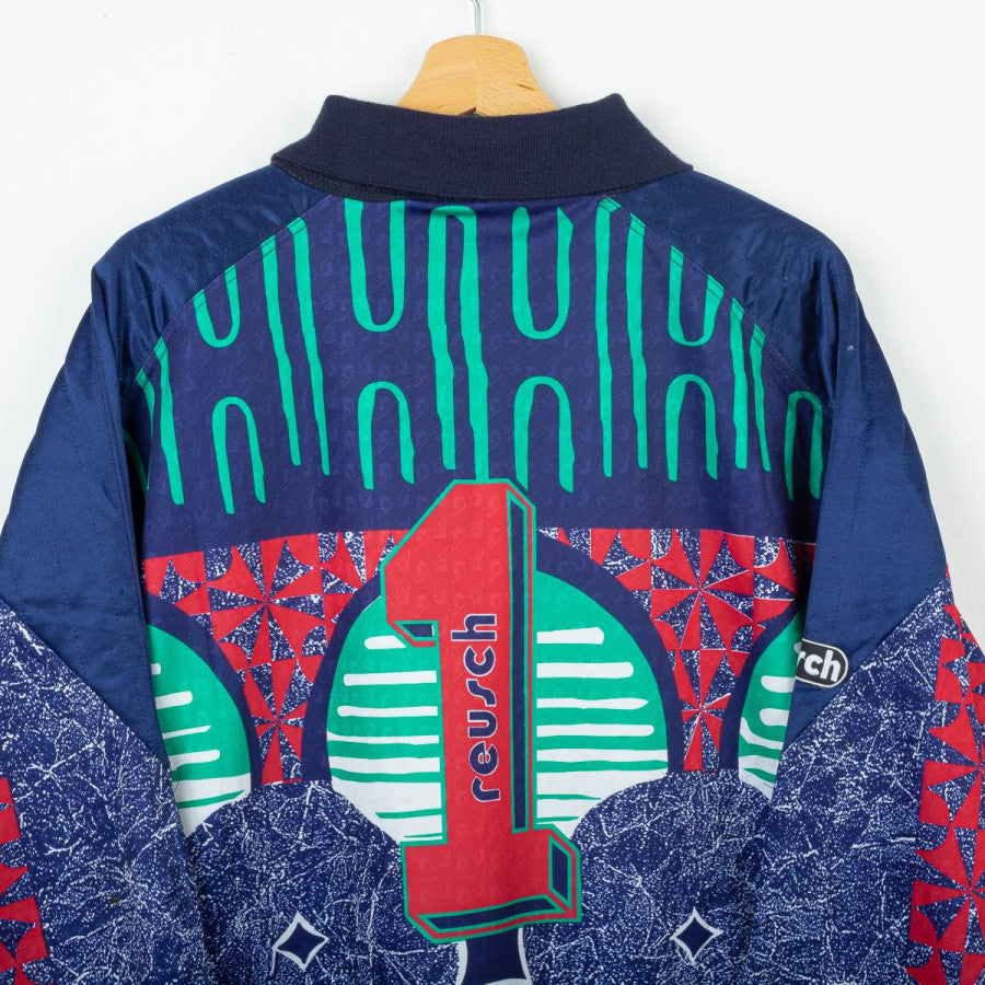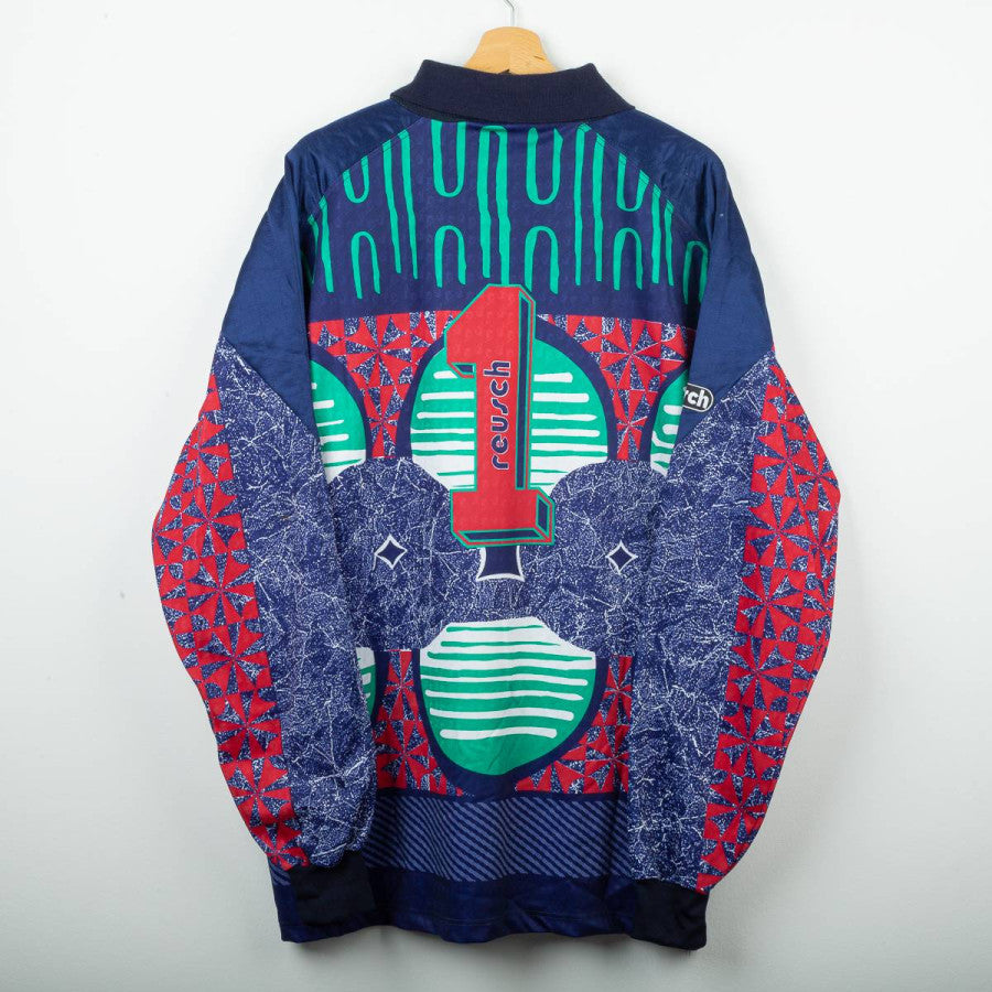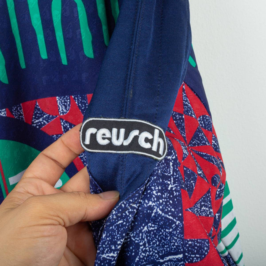 Juventus goalkeeper jersey from the 1992/1993 season produced by Kappa in collaboration with Reusch. Iconic '90s design featuring a multicolored geometric graphic in shades of blue, red, and green. Navy blue polo collar. White Kappa logo embroidered on the left chest and Reusch logo applied to both the chest and right sleeve. "Danone" sponsor printed centrally in white on a black background. Patch with two embroidered stars on the chest. Number 1 printed on the back with a three-dimensional Reusch-style graphic. Regular fit, technical polyester fabric. Size XL, Made in Italy. The jersey is from the personal collection of a former field photographer. The COA will be sent with the purchase of the jersey.