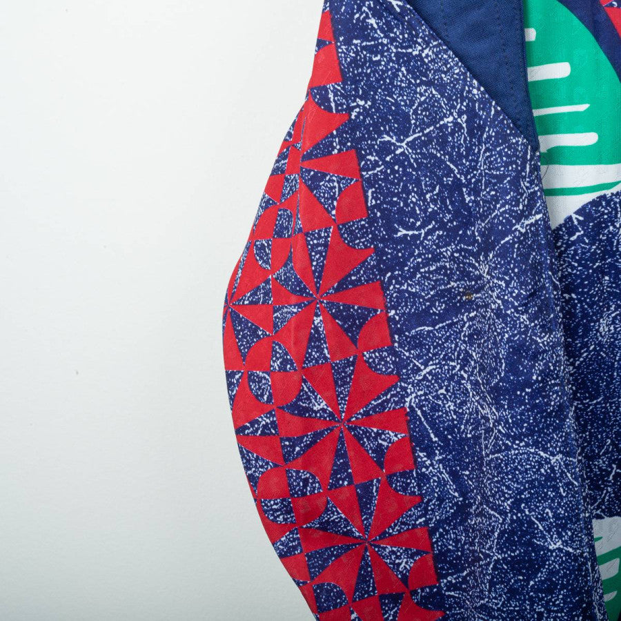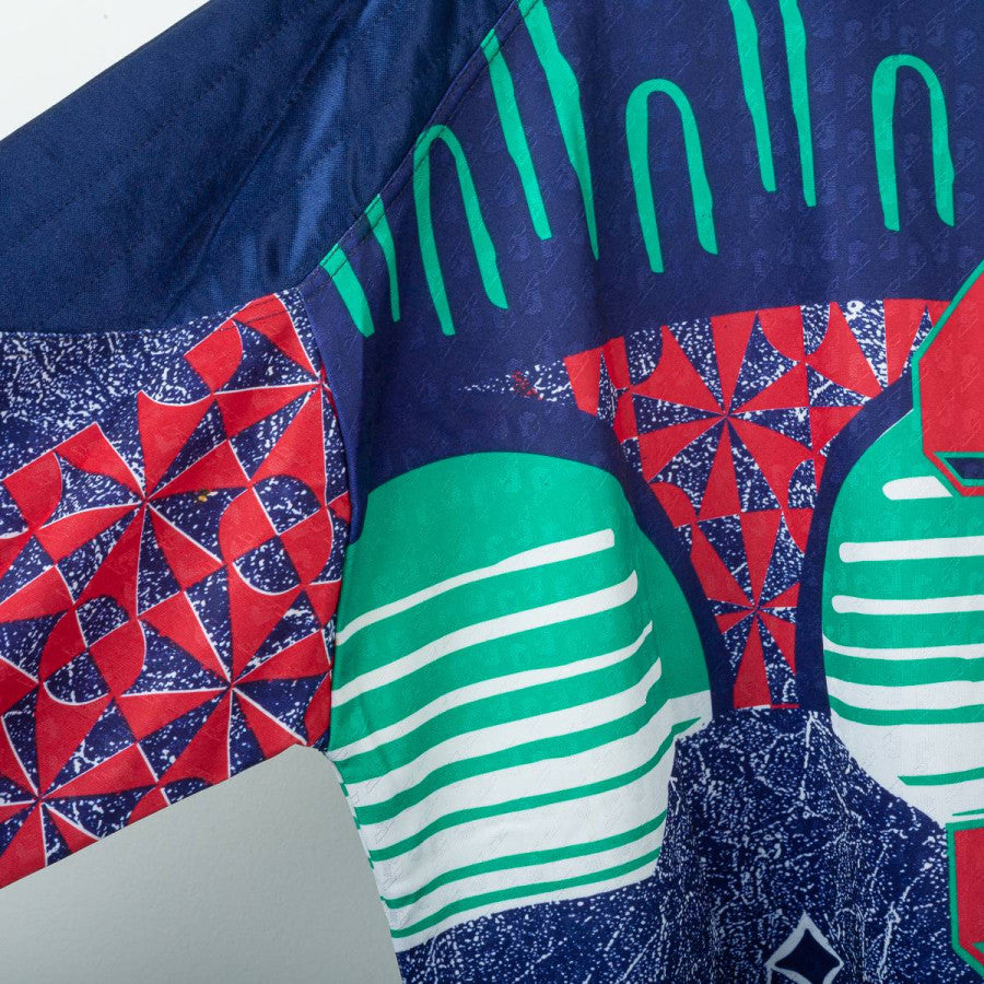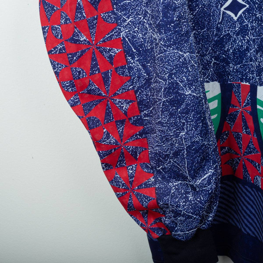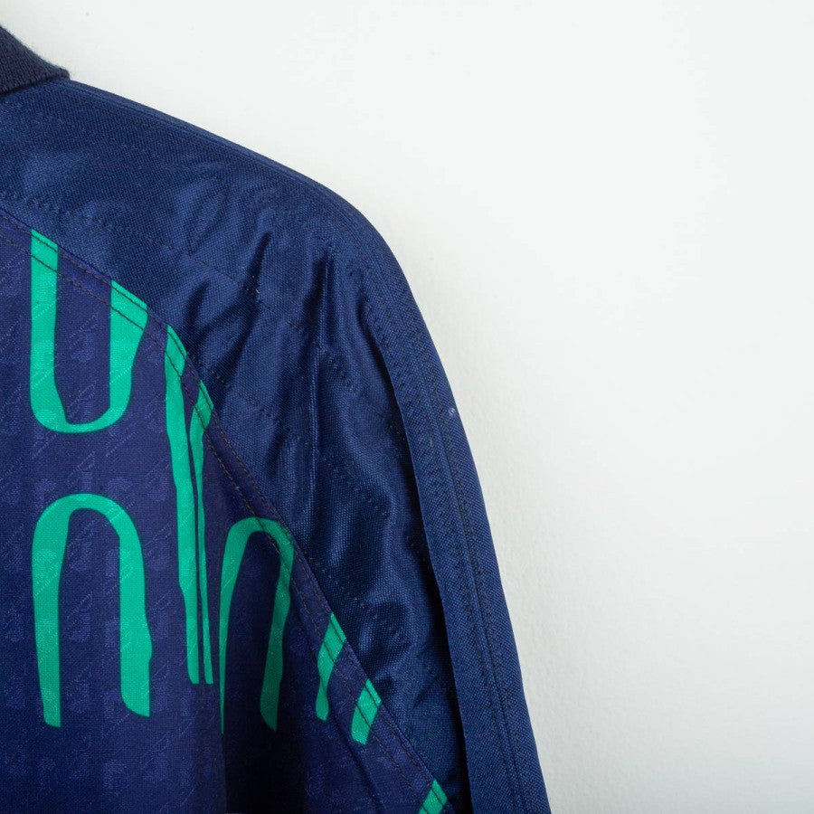 Juventus goalkeeper jersey from the 1992/1993 season produced by Kappa in collaboration with Reusch. Iconic '90s design featuring a multicolored geometric graphic in shades of blue, red, and green. Navy blue polo collar. White Kappa logo embroidered on the left chest and Reusch logo applied to both the chest and right sleeve. "Danone" sponsor printed centrally in white on a black background. Patch with two embroidered stars on the chest. Number 1 printed on the back with a three-dimensional Reusch-style graphic. Regular fit, technical polyester fabric. Size XL, Made in Italy. The jersey is from the personal collection of a former field photographer. The COA will be sent with the purchase of the jersey.