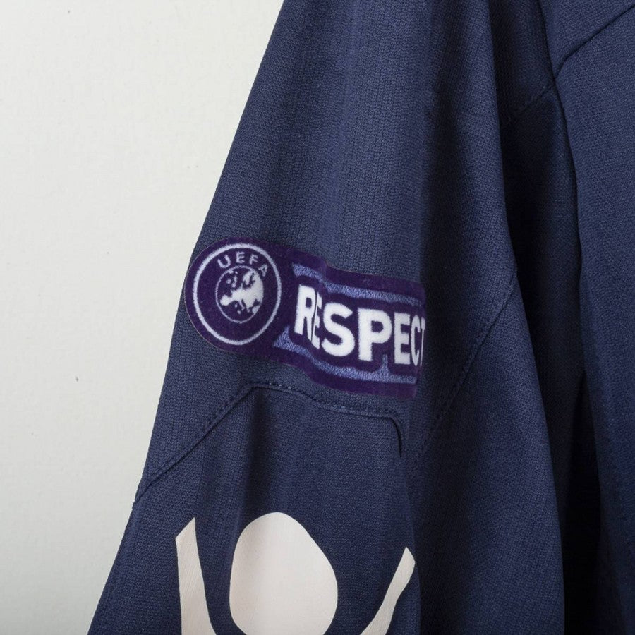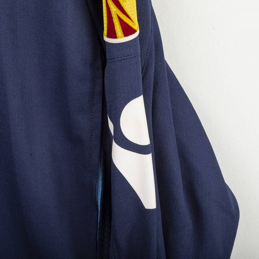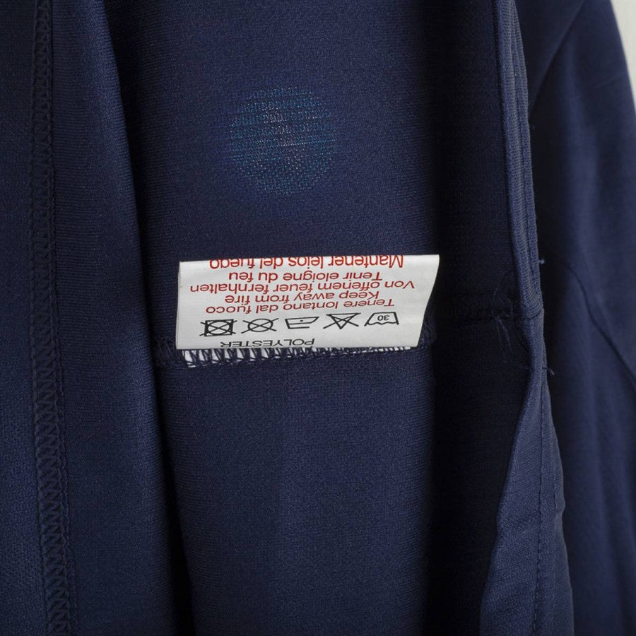 Napoli third shirt from the 2010/2011 season, made by Macron and prepared for the Europa League match Utrecht - Napoli (3-3). Long-sleeved design in navy blue with light blue details. Macron logo embroidered on the chest. Central Lete sponsor in sublimated print. SSC Napoli crest stitched on the left chest. Official UEFA Respect and Europa League patches applied on the sleeves. Back with Cavani name and number 7 in white with light blue outline. Regular fit. Size XL.