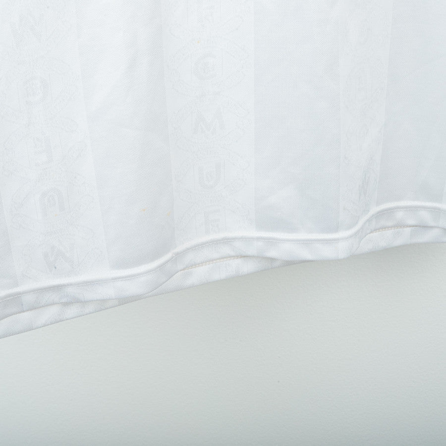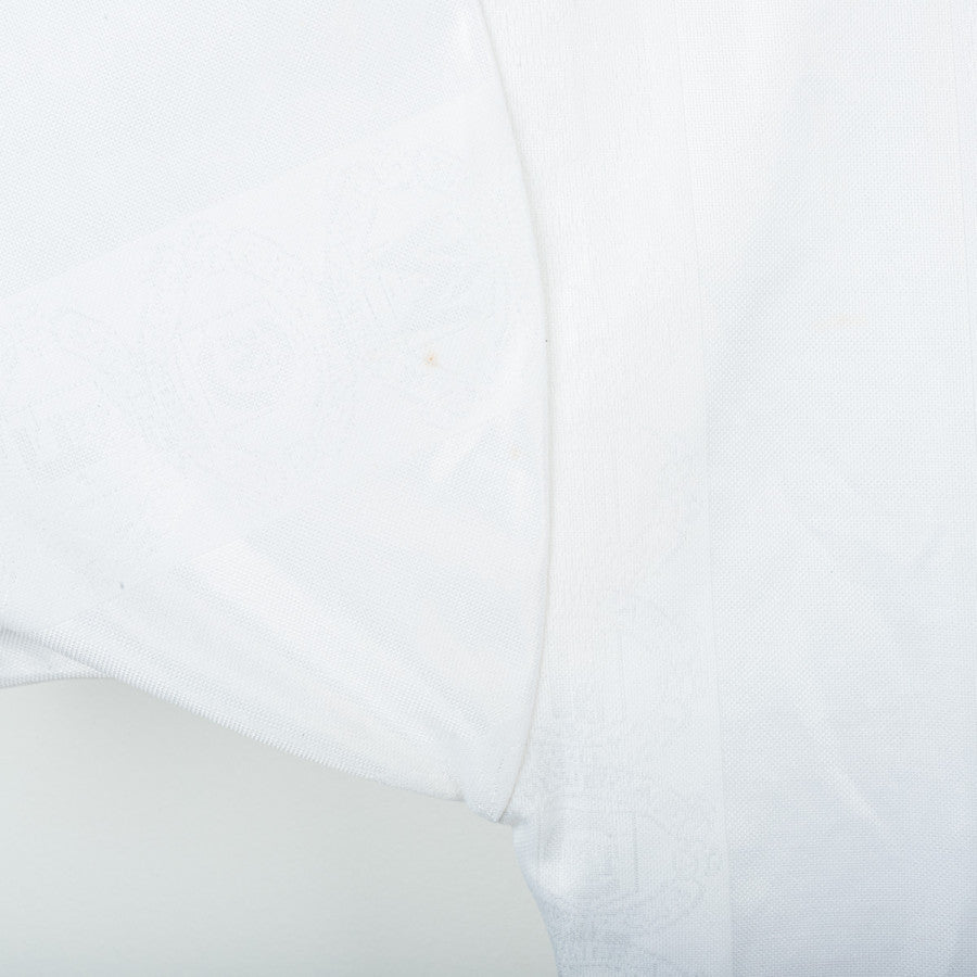 Manchester United away shirt from the 1997/1998 season, made by Umbro. White design with red and black horizontal stripes across the chest. Embroidered Umbro logo, stitched Manchester United crest on the left chest, and Sharp Viewcam sponsor in red and black flock. Black polo collar with red trim and club flag detail on the sleeve. Player name Beckham and number 7 in official black flock print on the back. Made with Umbro’s Vapa-Tech Performance fabric featuring subtle “MUFC” jacquard pattern. Size Large.