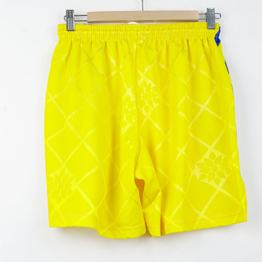 Official Parma Away shorts from the 1995/1996 season, designed by technical sponsor Puma. These vibrant yellow shorts feature blue accents along the sides and a unique diagonal stripe pattern with a honeycomb texture. The Parma crest is embroidered on the right leg, with the Puma logo on the left. Equipped with an elastic waistband and adjustable drawstring, they’re a standout piece of the club’s history.
