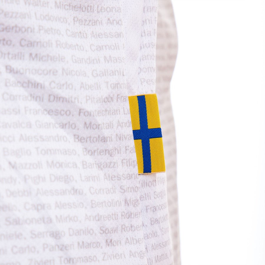 Parma Home Jersey season 2012/2013 short sleeve of Alessandro Lucarelli. On the front appear the logos of the commercial sponsor Folletto and Navigare, with the names of the fans in sublimation throughout the weave of the fabric. The Parma logo is sewn on the heart side. The Lega Serie A patch is sewn on the right sleeve, the Errea logos are sublimated on both sleeves, while the LUCARELLI lettering and the number 6 are applied in black on the back. On the bottom there is the Parma FC OFFICIAL sticker.