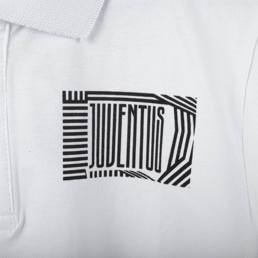 Official Juventus white polo shirt featuring a black graphic print with the “JUVENTUS” name and club logo on the chest. Classic collar with three-button closure and plain back. Includes inner official Juventus label.