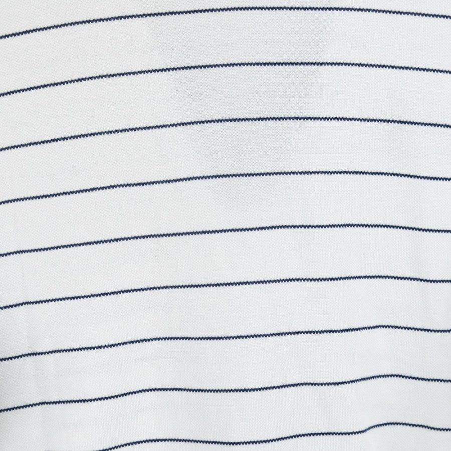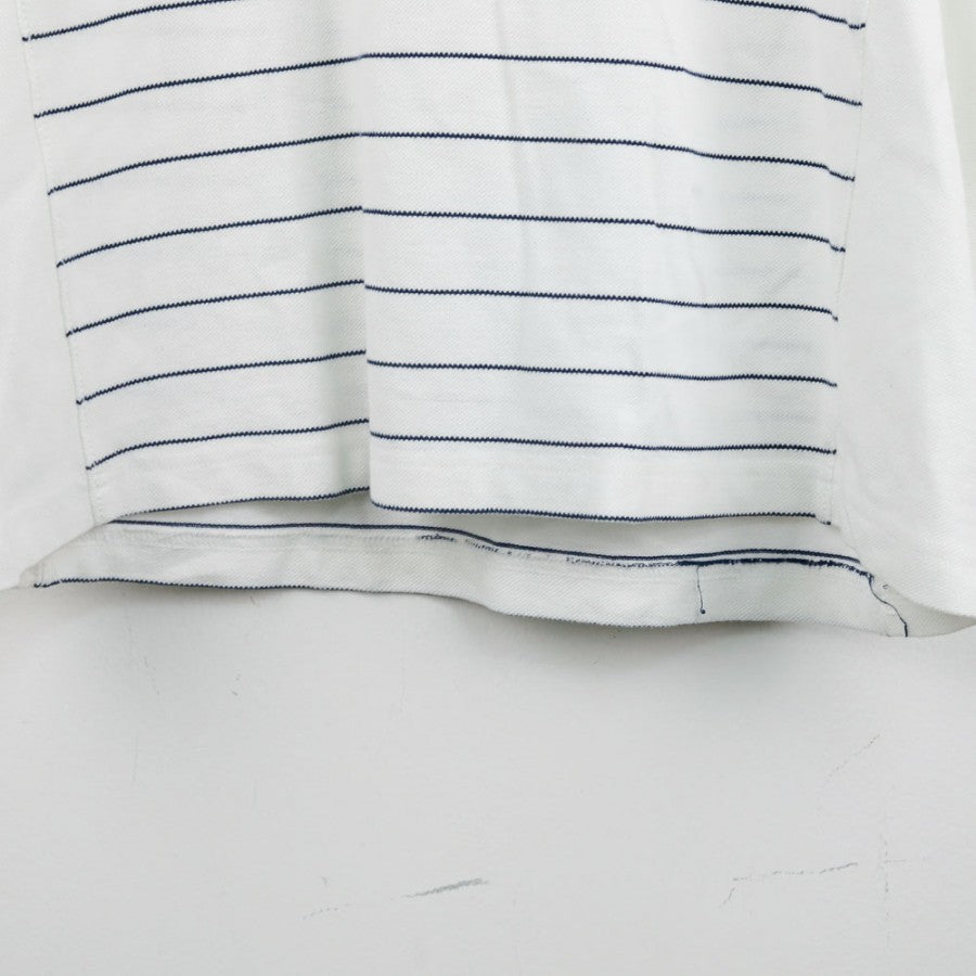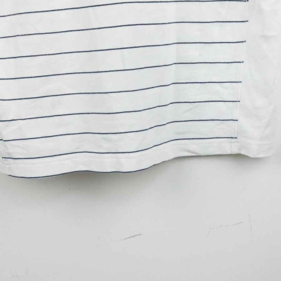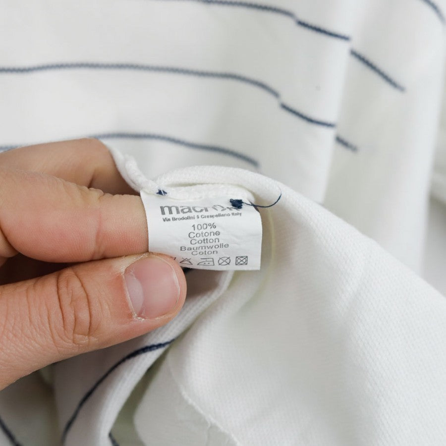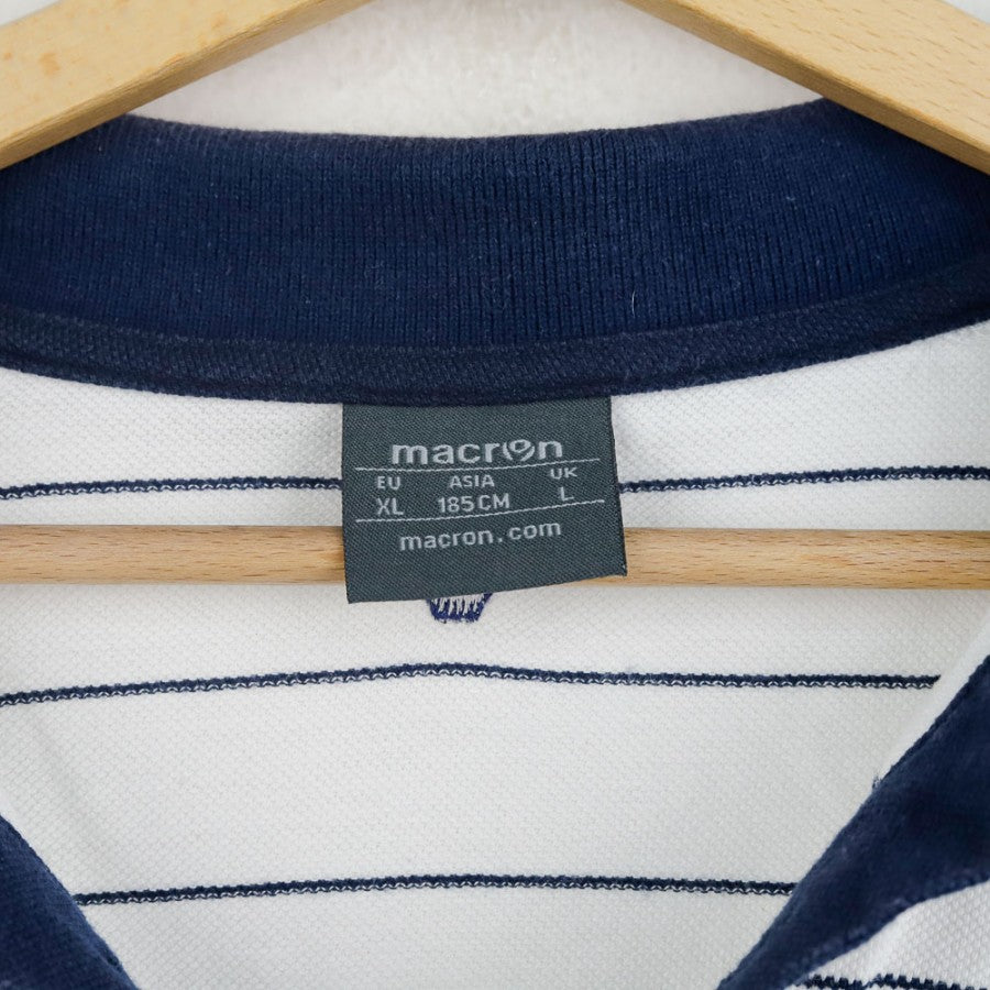 Official Cagliari polo for the 2010/2011 season, made by Macron. The design features a white base with thin horizontal blue stripes, a blue collar, and red details on the sleeve edges. The Macron logo and Cagliari club crest are displayed on the chest, while the Macron symbol is visible on the back below the collar. Size XL.