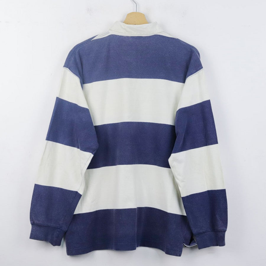 Official Fiorentina polo shirt for the 1995/1996 season, produced by technical sponsor Reebok. This casual wear item features horizontal white and navy blue stripes, with long sleeves and a classic white collar. The Reebok logo and Fiorentina crest with the iconic red lily are embroidered on the chest. Size XL, a perfect addition for collectors or fans seeking a vintage and unique style.
