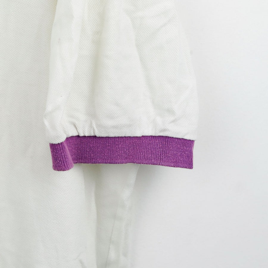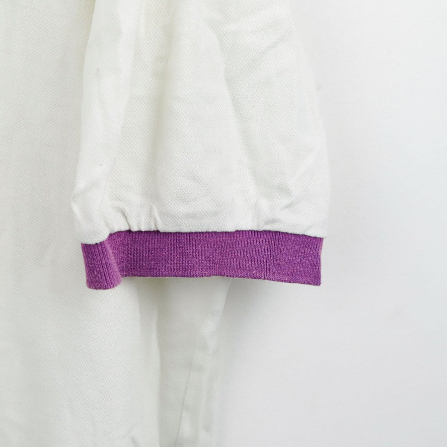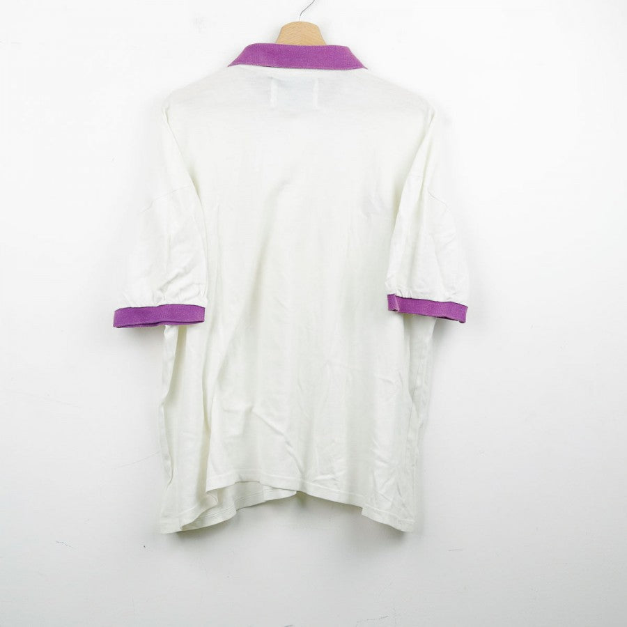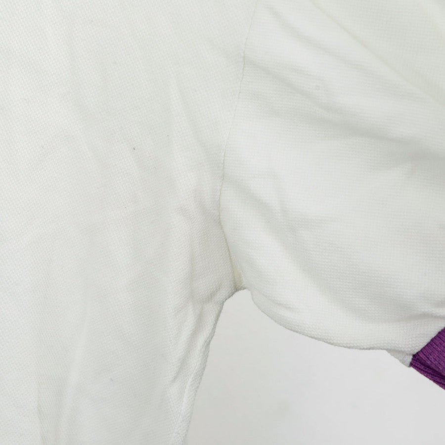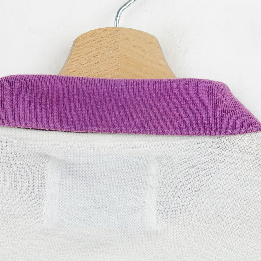 Official Fiorentina polo from the 1993/1994 season, produced by technical sponsor Uhlsport. This vintage design features a clean white base with purple details on the collar and cuffs. The Uhlsport logo is embroidered on the right chest, while the Fiorentina crest is applied on the left. Made from soft cotton, the polo offers a comfortable fit and is labeled in size XL. A timeless piece for fans and collectors who appreciate retro football apparel.