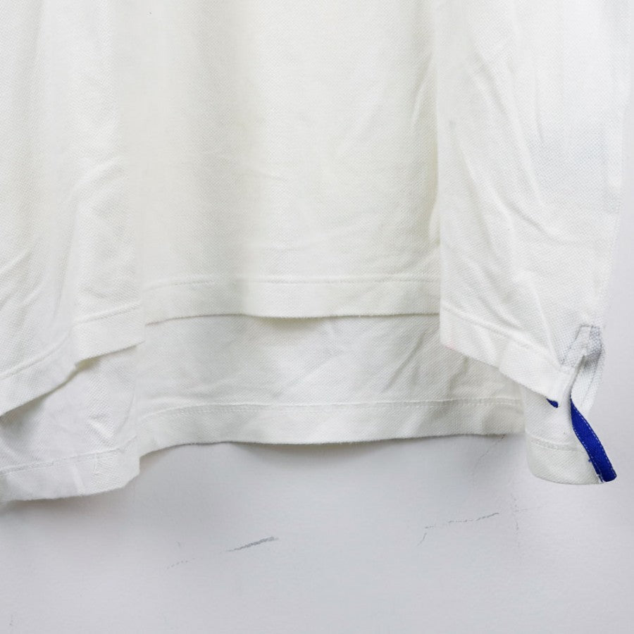 Official Italy National Team polo by Kappa from 1999. This classic design features a white base with a blue horizontal stripe across the chest. The collar and sleeve edges are also blue, giving it a refined yet sporty look. The FIGC crest is stitched on the left chest, while the Kappa logo is embroidered on the right. Made from breathable fabric, this polo is a stylish way to support the Azzurri. Size XL.