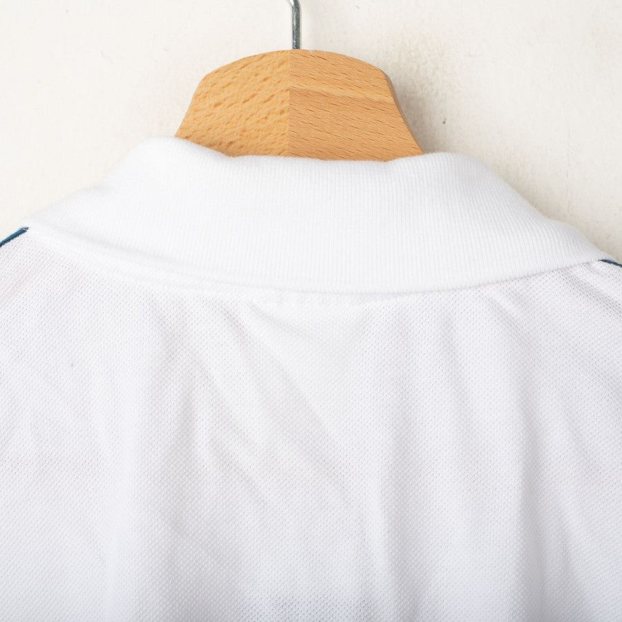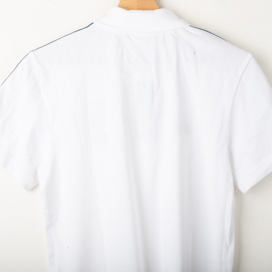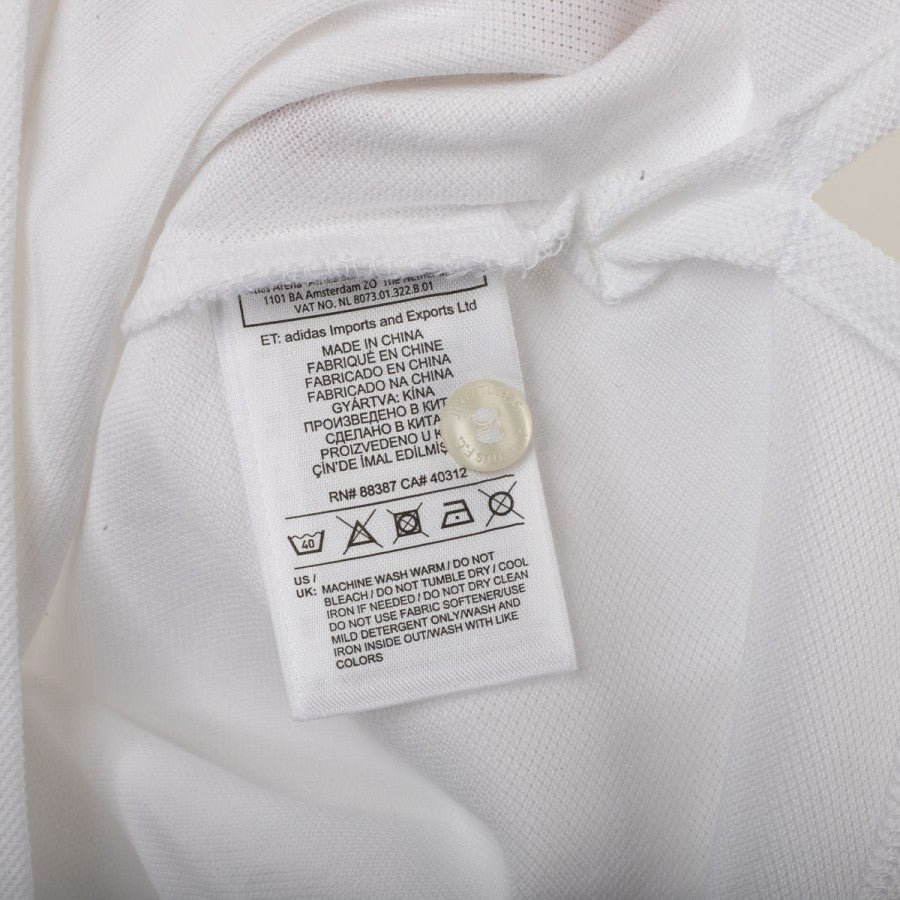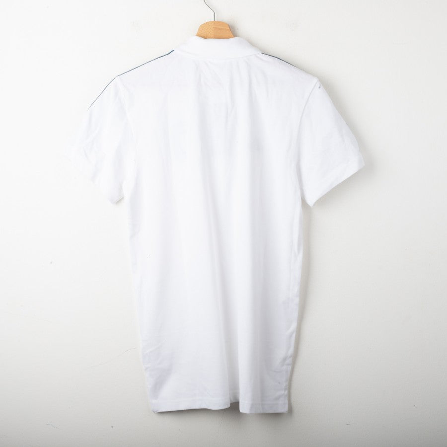 Juventus Adidas polo shirt from the 2017/2018 season. White color with petroleum blue accents. Applied Adidas logo and Juventus crest on the chest, three-stripe detailing on the shoulders, and a classic three-button polo collar. Regular fit. Size S.